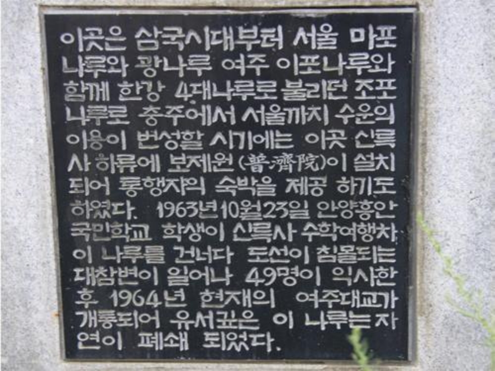 조포나루는 경기도 여주군 북내면 천송리(川松里)에 있는 고려시대의 나루터로 마포나루, 광나루, 이포나루와 함께 조선시대 4대 나루로 불렸으며 완만한 지대에 자리 잡고 있어 무거운 물자가 많이 운송되었다.