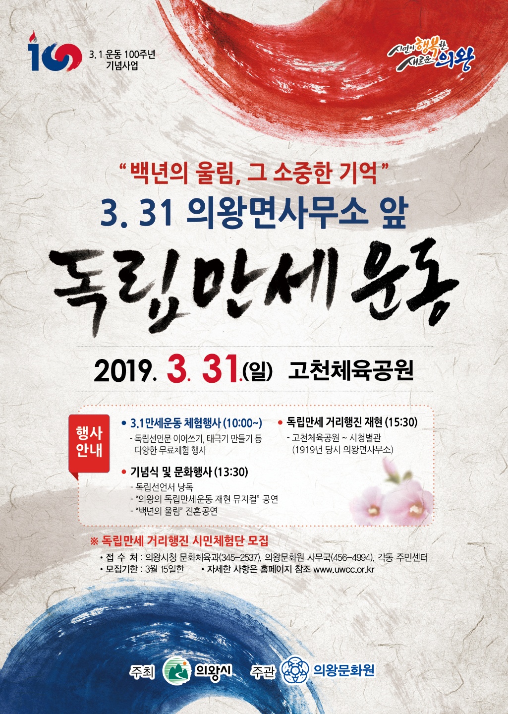 이날 행사는 고천체육공원에서 오전10시부터 다채로운 체험 행사들이 진행되고 오후 1시30분 기념식과 독립만세운동 재현 뮤지컬 공연, 100년의 울림 진혼 공연 등 문화행사에 이어 오후 3시30분 고천체육공원을 출발해 시티병원을 거쳐 의왕시청별관(옛의왕면사무소)까지 독립만세 거리행진을 재현한다.