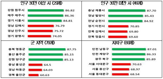 실태조사에 따르면 안양시는 인구 30만 이상 시(29곳) 평가에서 79.40(D등급)으로 21위를 차지했다. 군포시는 인구 30만 미만 시(49곳) 평가에서 82.52(B등급)로 9위, 의왕시는 82.53(B등급)으로 8위를 차지했다.