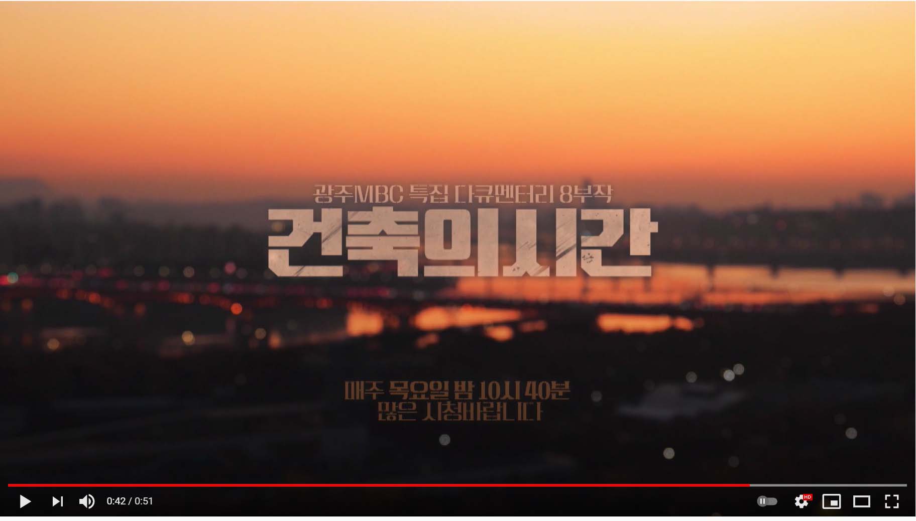 광주MBC가 건축물이 삶에 어떤 영향을 미치는지를 보여주는 프로그램으로 UHD 특집 다큐멘터리 8부작 '건축의 시간'을 방영했는데 전문가뿐 아니라 일반 시청자들의 반향 또한 뜨겁다.