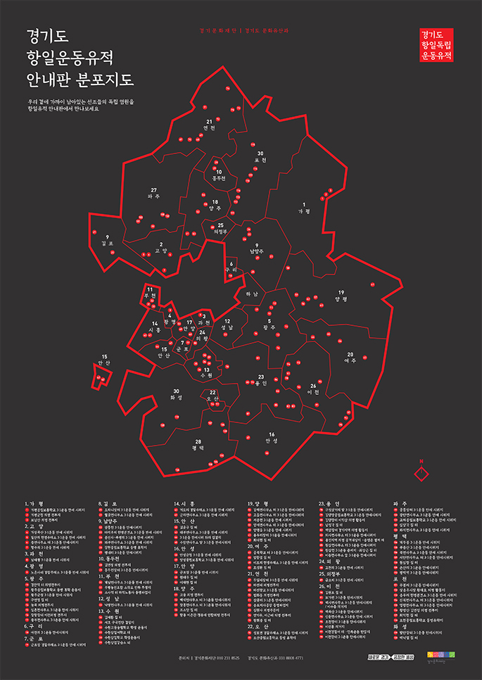 경기도가 도내 166곳 항일운동 유적지에 안내판(121곳)과 표지판(45곳) 설치을 마무리한데 이어 유적지 안내지도를 제작해 31개 시ㆍ군, 보훈처, 도내 초ㆍ중학교에 배부하고 DBF파일로도 제작해 인터넷을 통해 공개했다.