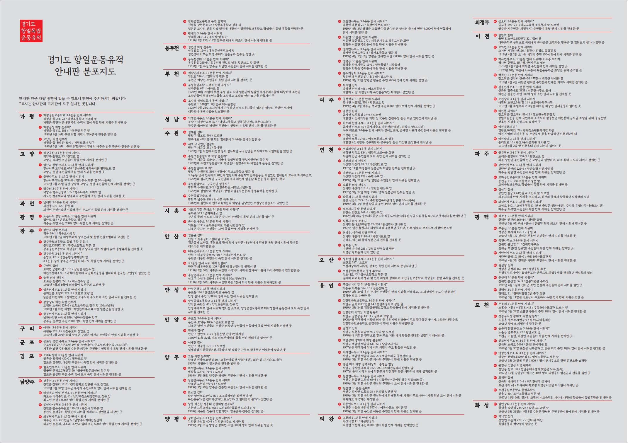 경기도가 도내 166곳 항일운동 유적지에 안내판(121곳)과 표지판(45곳) 설치을 마무리한데 이어 유적지 안내지도를 제작해 31개 시ㆍ군, 보훈처, 도내 초ㆍ중학교에 배부하고 DBF파일로도 제작해 인터넷을 통해 공개했다.