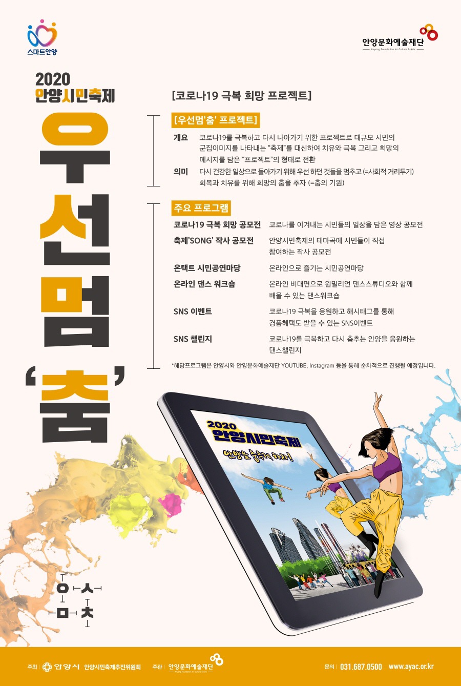 안양시민축제는 매해 연인원 30만여 명이 참여하는 안양시 최대 축제로 2020년에는 코로나19 확산과 태풍으로 인한 재난 상황 등을 고려해 축제를 잠시 멈추고 우선멈‘춤’프로젝트라는 이름으로 온라인으로 비대면 축제를 처음으로 개최했다.