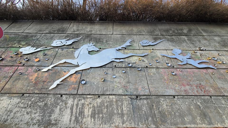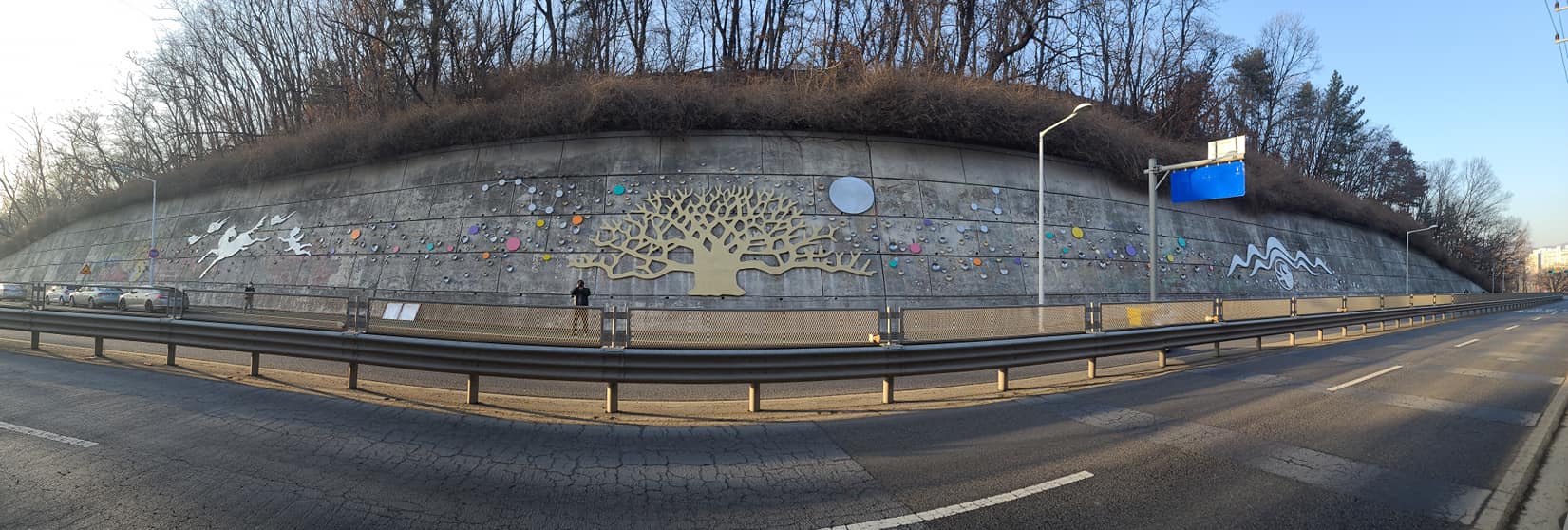 ①오봉산 이야기’는 전설 속 이야기 아기장수와 용마의 꿈을 주제로 왕송호수와 의왕시청을 연결하는 오봉로 이동삼거리 고갯마루에 위치한 옹벽에 지역주민들이 기증한 스테인리스 용기와 양은 그릇들을 사용한 새로운 유형의 상징적 조형작업을 시도한 설치 미술품이다.