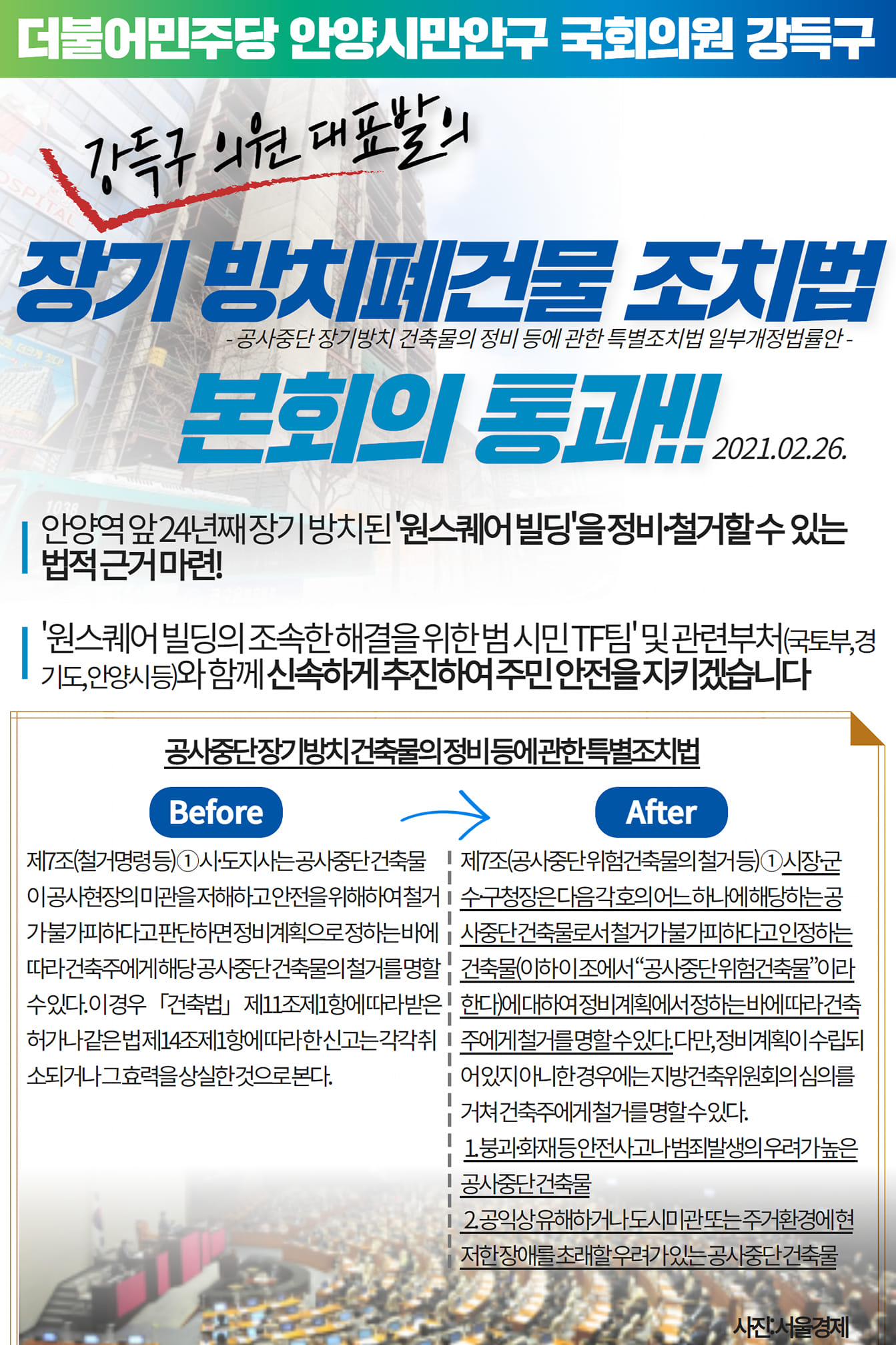 더불어민주당 강득구(경기 안양만안) 의원은 ‘공사중단 장기방치 건축물의 정비 등에 관한 특별조치법’이 국회 본회의를 통과했다고 2일 밝혔다.