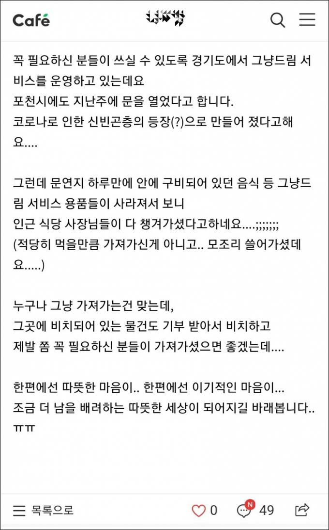 한편 앞서 개장한 타 지자체의 경우 공짜 심리를 타고 마구잡이로 물건을 가져가는 몰지각한 행동으로 진열대가 텅텅 비어 정작 필요한 사람이 발길을 돌려는 하는 경우도 발생하고 있다.