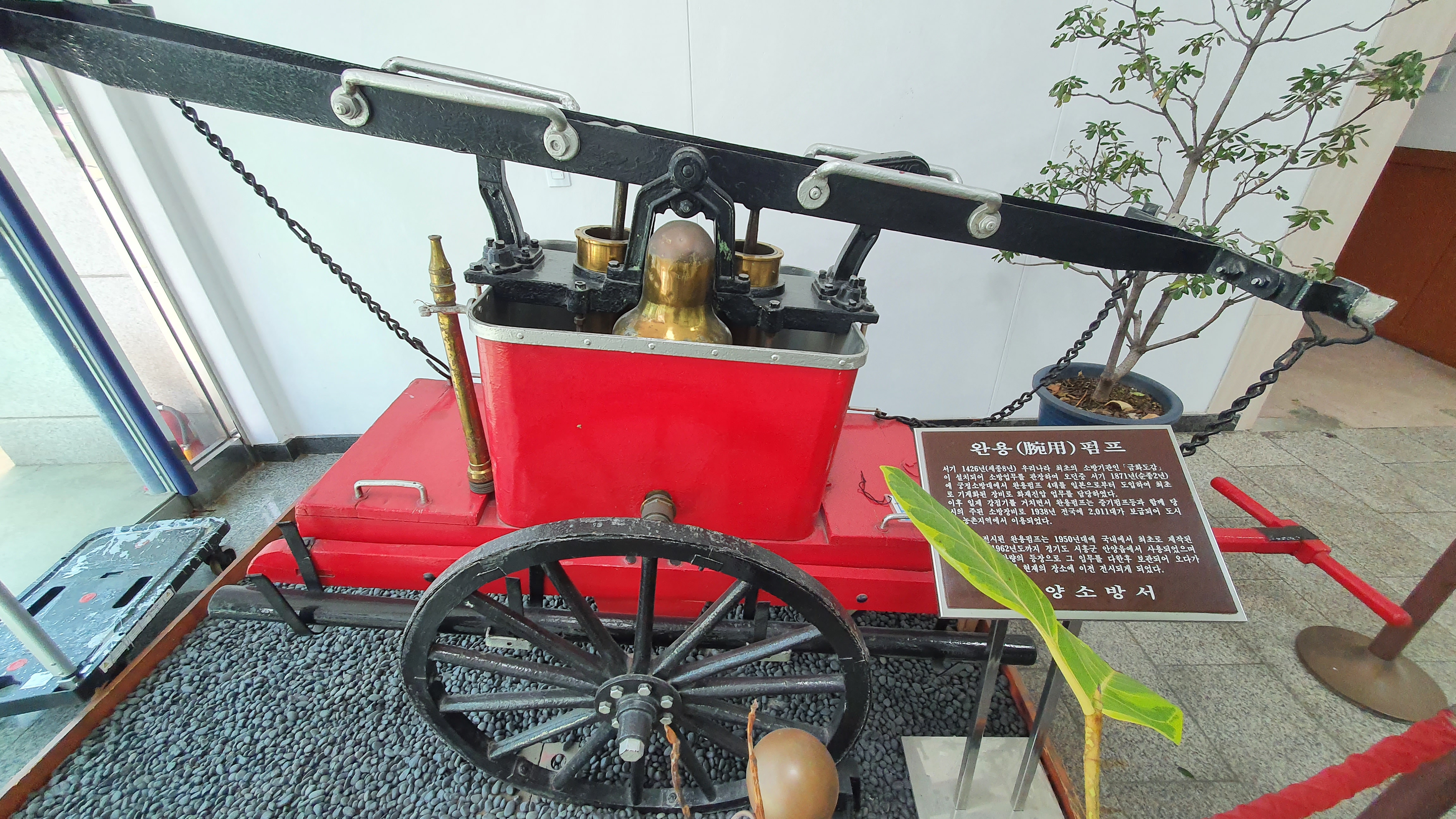 완용펌프는 수레에 싣고 인력으로 이동해 수동으로 소화수를 뿌리는 장비로 우리나라 소방기구 역사 초기 상황을 보여주는 유물로 꼽힌다.