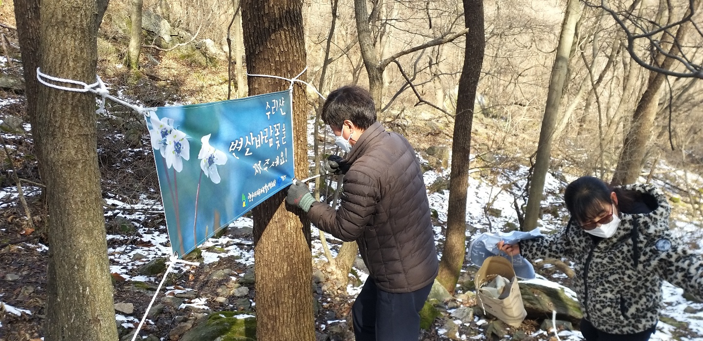 안양지속협은 해마다 10-20여명의 위원들이 수리산 계곡을 찾아 변산바람꽃 싵태도 확인하고 현수막을 걸고 사진작가들에게 홍보전단을 전하며 변산바람꽃 보호해줄 것을 당부하는 등의 캠페인을 전개했는데 금년에는 코로나19로 안양지속협 유승명 사무국장과 김춘화 녹색의제위원회 위원장 등 소수 인원이 지난 3일 “수리산 변산바람꽃을 지켜주세요! 현수막을 부착하고 활동을 전개했다.