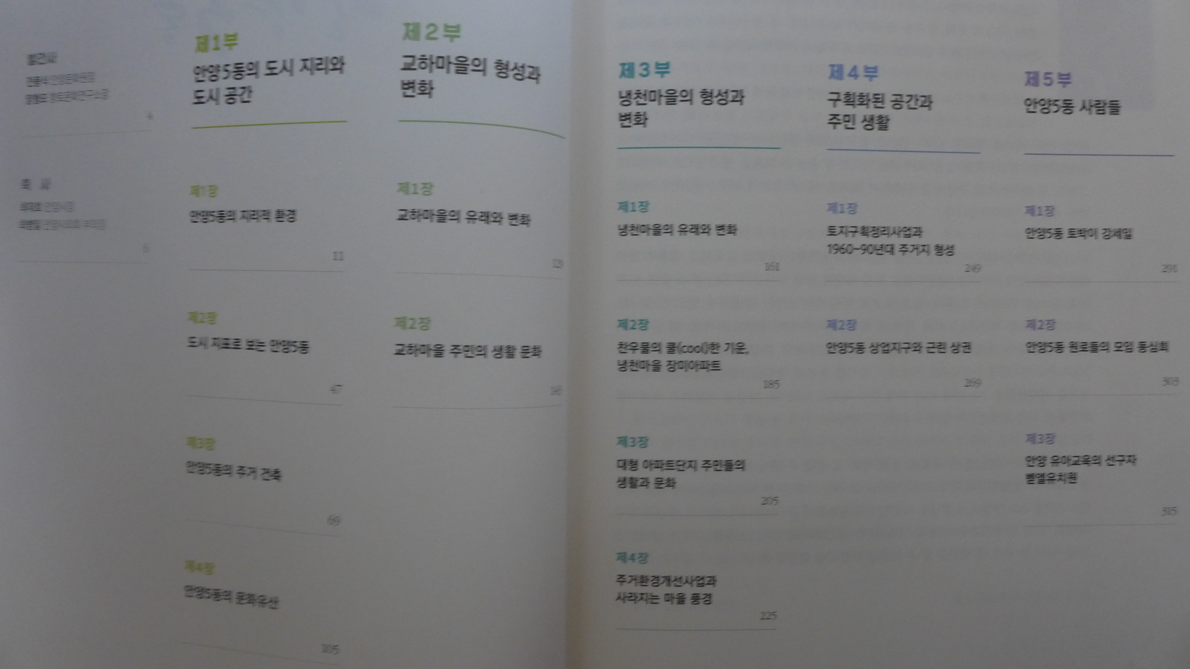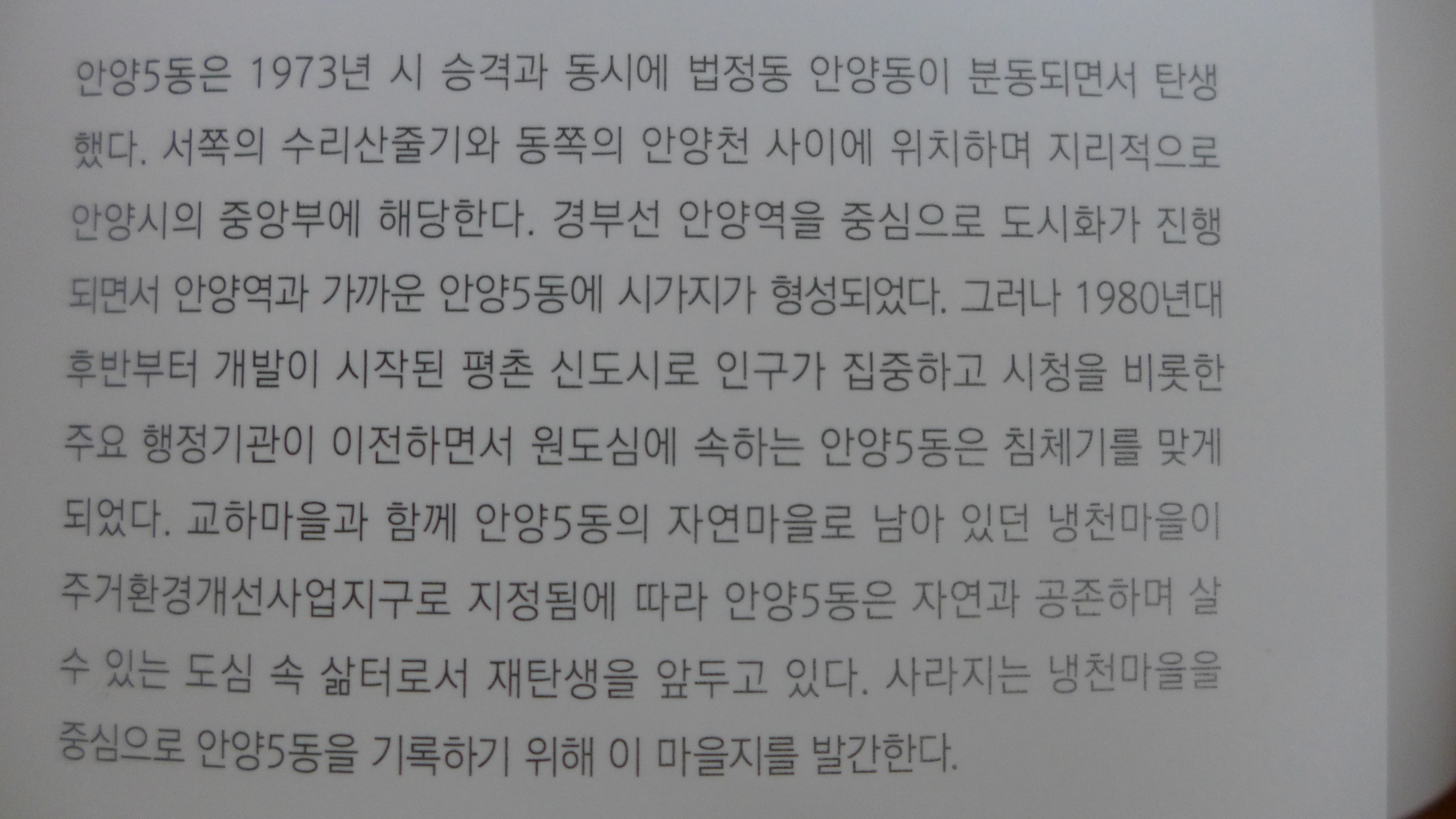 5동마을지를 살펴보니 안양5동의 자연마을인 냉천마을과 교하마을을 중심으로 안양5동 지역의 역사, 마을의 형성과 변화, 주민들의 삶과 문화 등을 문헌 조사, 현지 조사, 구술 조사 등을 바탕으로 역사, 지리, 민속 등 인문사회분야의 학제간 연구를 통해 집필되었으며, 특히 주거환경개선사업으로 사라지는 냉천마을의 모습을 담아냈습니다.
