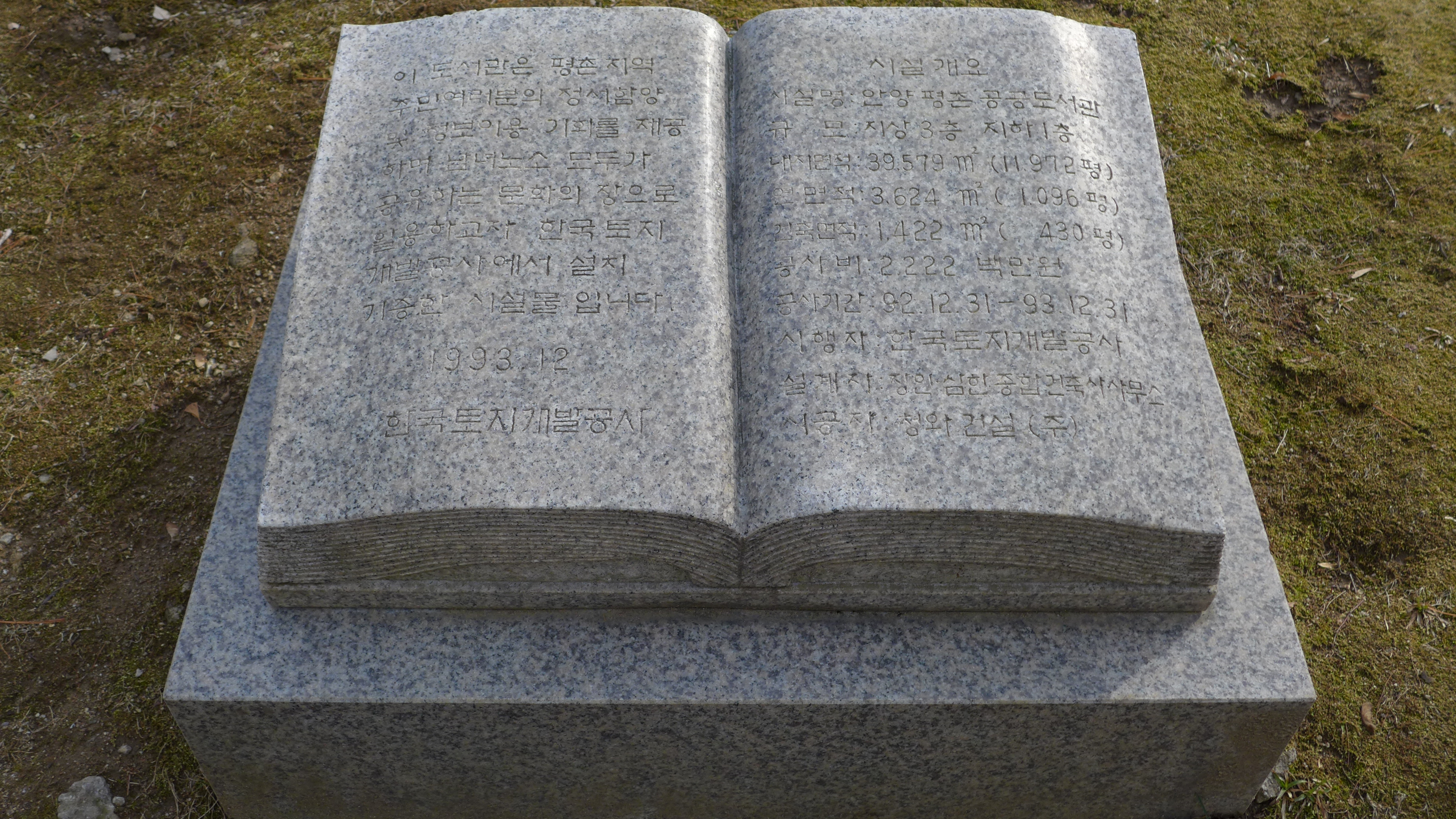 평촌도서관은 1993년 평촌신도시를 조성한 한국토지공사에 의해 지하1층 지상3층 규모로 지어져 1994년 기부채납을 받았으며 열람실과 자료실, 노트북실 등 있다.