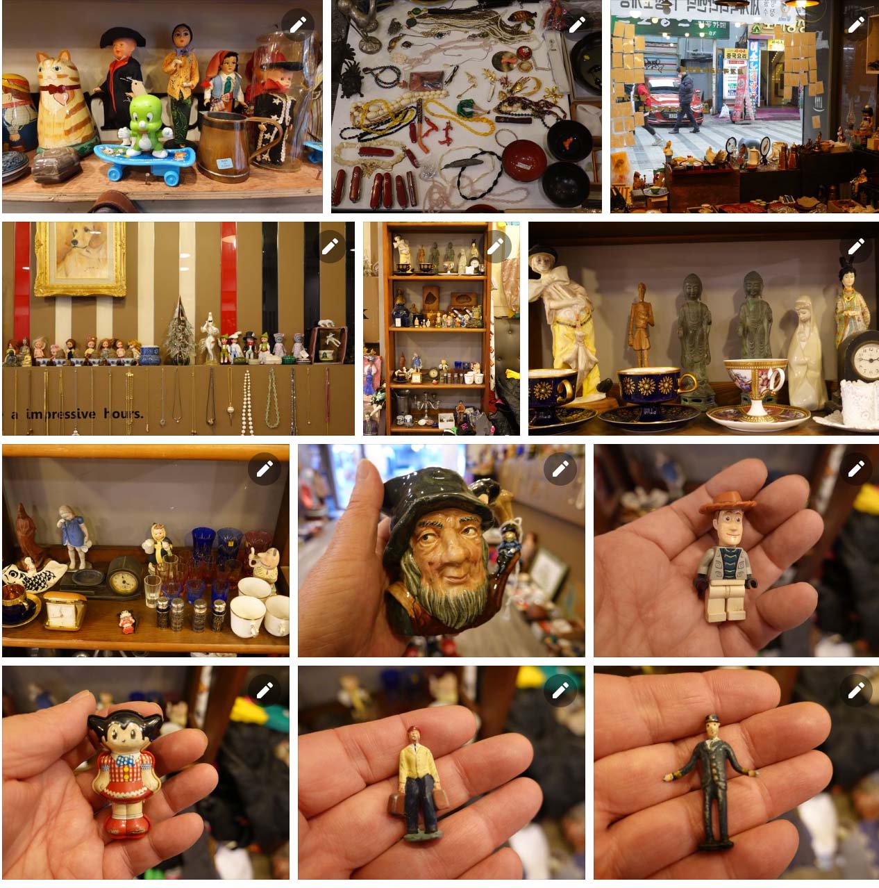 그림을 그리고 차를 타고 도자기를 만들고 내노라 하는 연예인들 주물럭주물럭 마사지하고 시간이나면 전국 벼룩시장을 돌며 장난감이며 세계각국 엔틱 물건을 수집해 오는 털보 김석용 작가의 안양일번가 방물장수 점방에 들어서면 벼룩시장에서 건져올린 온갖 보물들이 새로운 주인을 기다리고 있다.