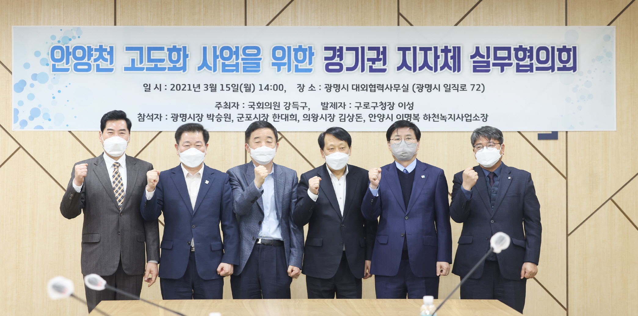안양천을 공유하는 서울 구로구와 경기도 군포시, 안양시, 의왕시, 광명시 등이 강득구(안양만안.더불어민주당) 국회의원 주최로 열린 ‘안양천 고도화사업을 위한 경기권 지자체 실무협의회’에서 지자체들간의 상호 긴밀한 협조하에 체계적이고 효율적으로 하천을 유지 관리할 수 있는 협력방안 등을 논의됐다.
