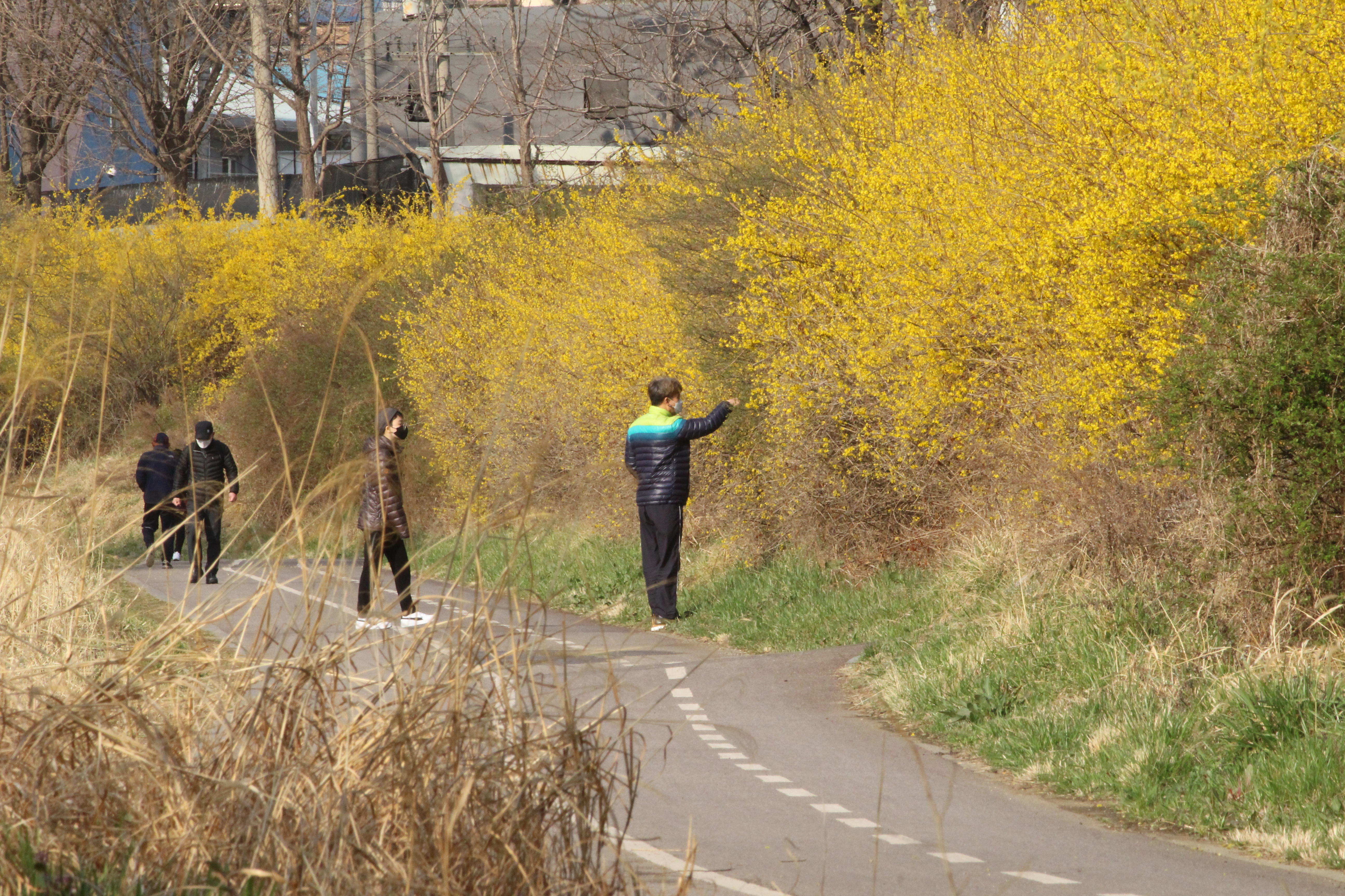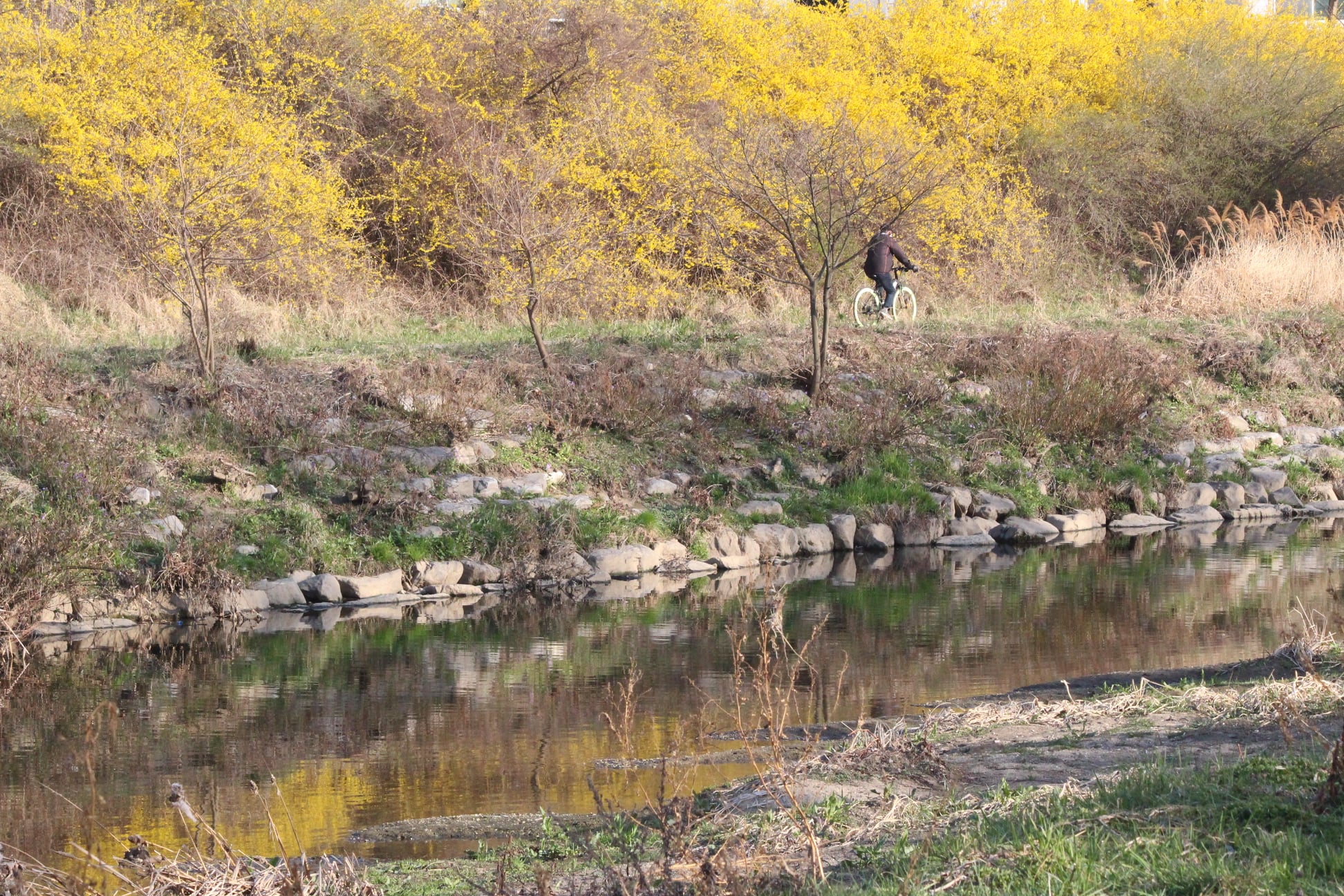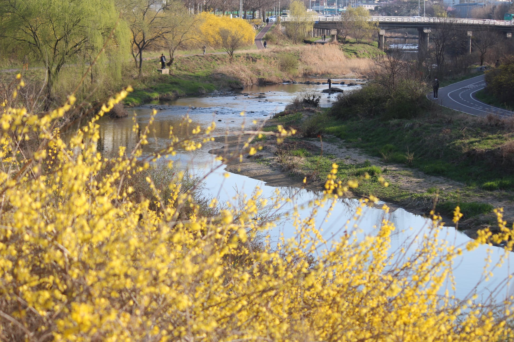 아쉽다면 천변을 따라 이어지는 노랑 물감을 풀어놓은듯한 개나리군락 중간 중간이 비어있는데 안양시 관리 부서가 이곳에도 개나리를 심어 천변이 노랑 물감을 쭈욱 풀어놓은 듯한 풍경을 만들어 주었으며 하는 바람이 있지요.