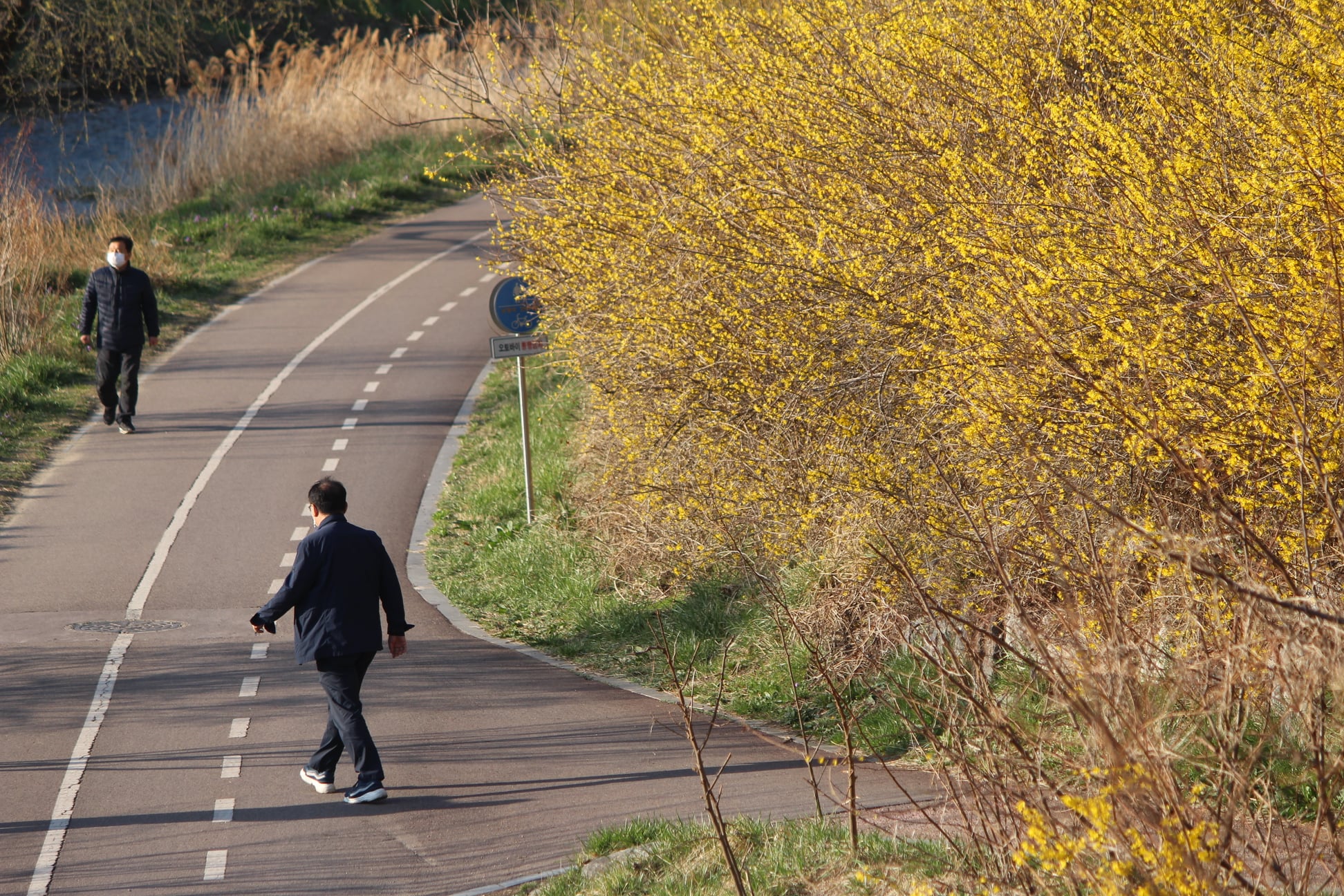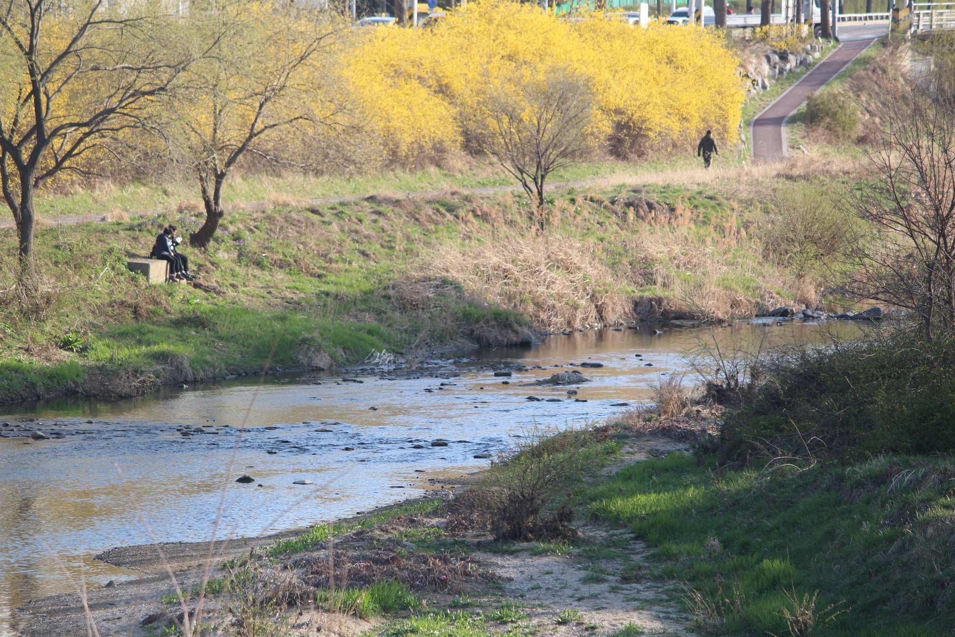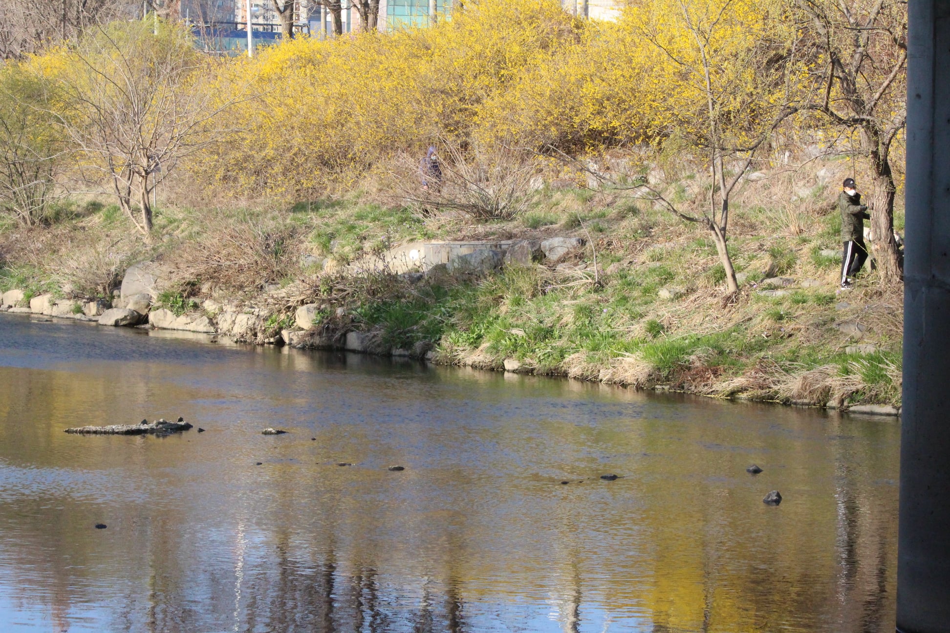 아쉽다면 천변을 따라 이어지는 노랑 물감을 풀어놓은듯한 개나리군락 중간 중간이 비어있는데 안양시 관리 부서가 이곳에도 개나리를 심어 천변이 노랑 물감을 쭈욱 풀어놓은 듯한 풍경을 만들어 주었으며 하는 바람이 있지요.