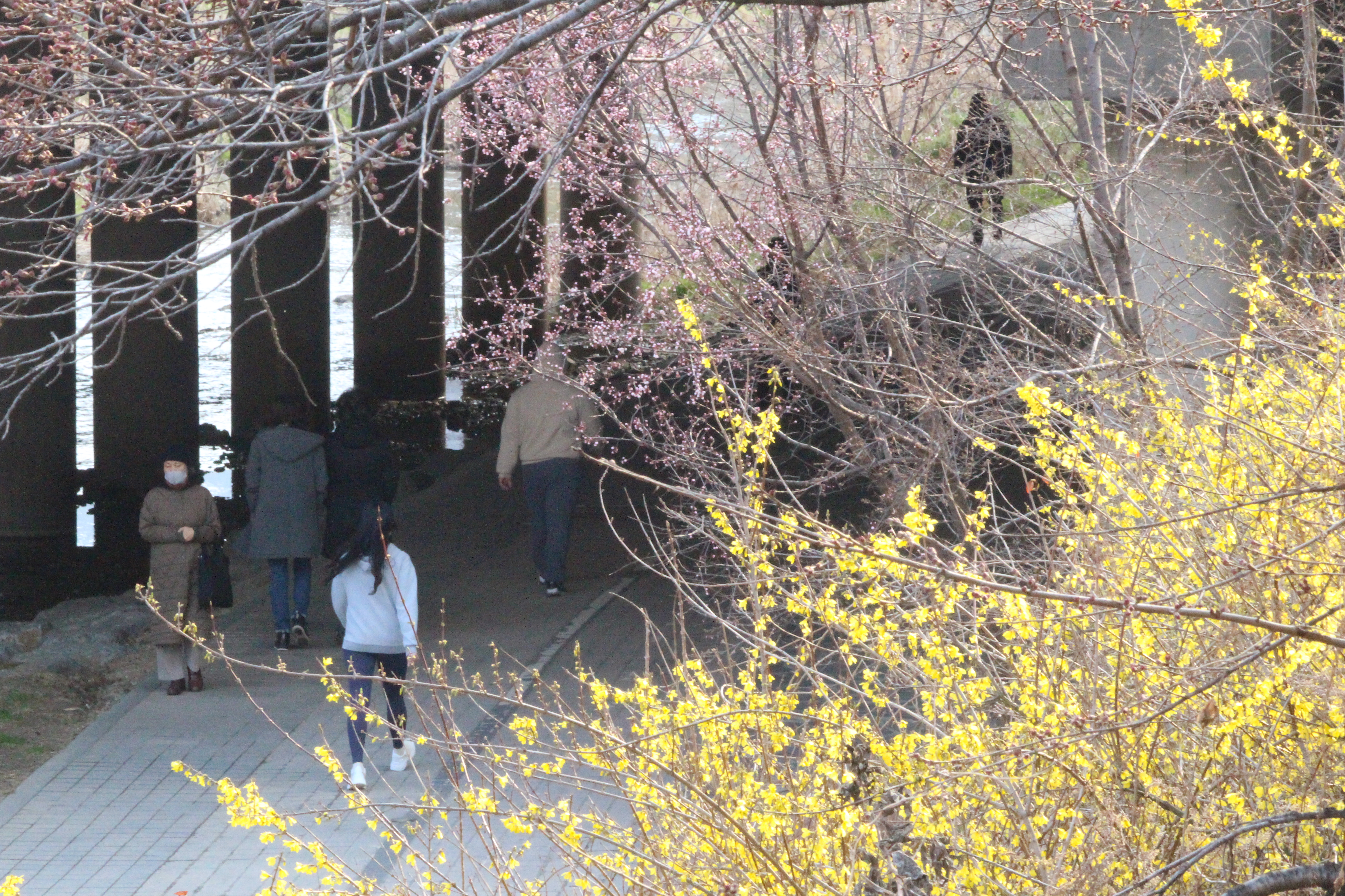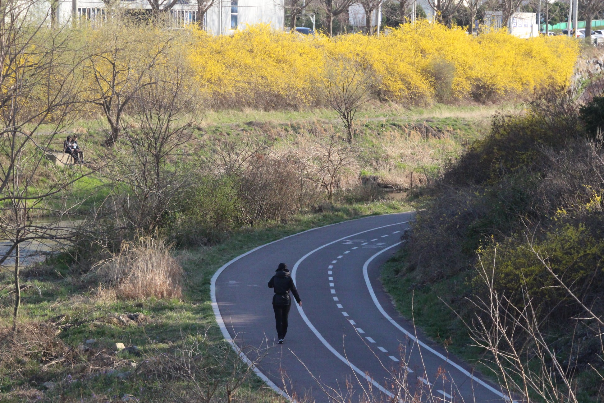 아쉽다면 천변을 따라 이어지는 노랑 물감을 풀어놓은듯한 개나리군락 중간 중간이 비어있는데 안양시 관리 부서가 이곳에도 개나리를 심어 천변이 노랑 물감을 쭈욱 풀어놓은 듯한 풍경을 만들어 주었으며 하는 바람이 있지요.