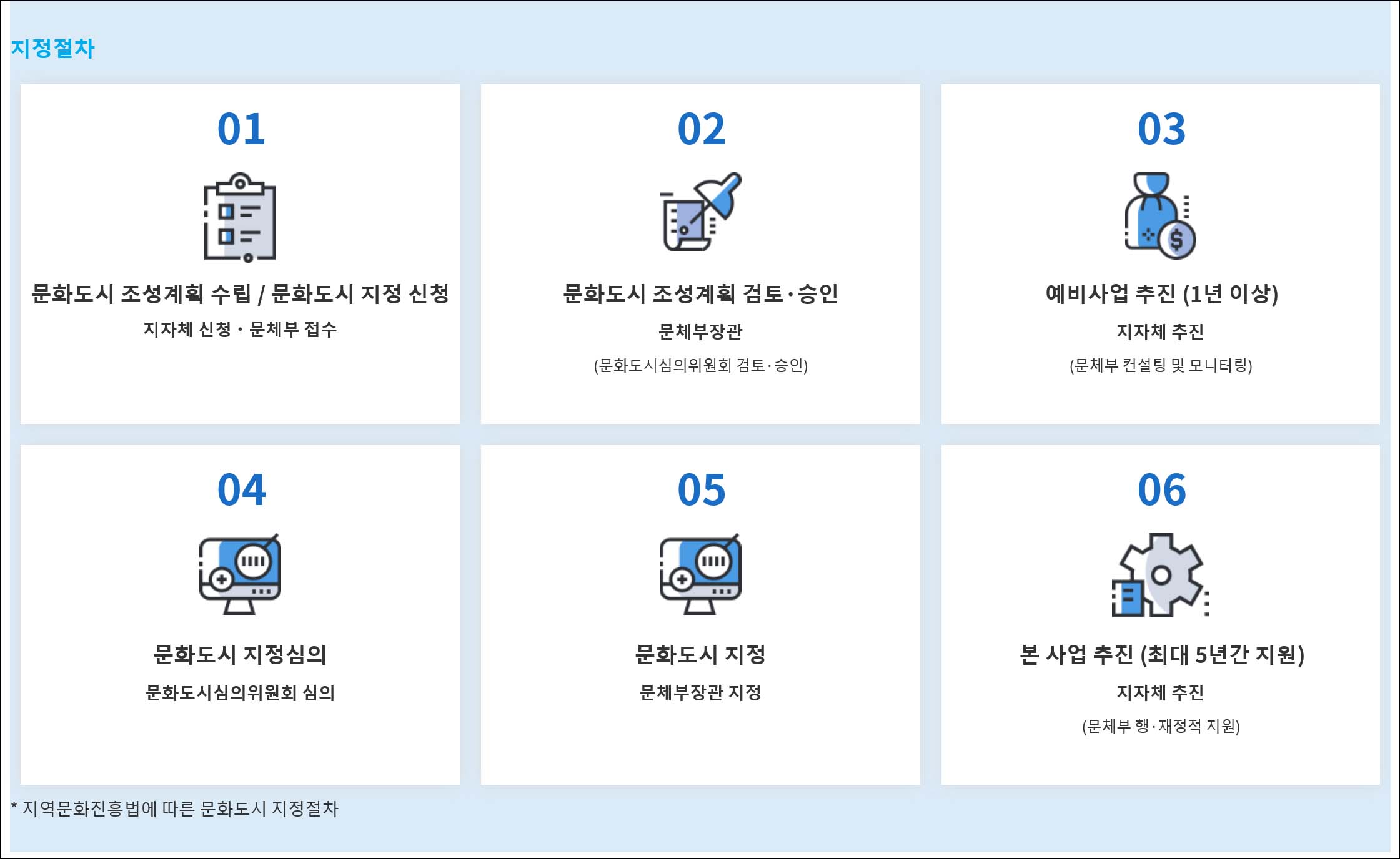 문화도시는 ▲지자체의 ‘문화도시 조성계획 수립 및 문화도시 지정 신청 ▲문체부의 조성계획 승인 ▲예비도시의 1년간의 예비사업 추진 ▲문체부의 예비사업 추진 실적 평가 및 심의위원회의 심사 등을 거쳐 최종 지정된다.