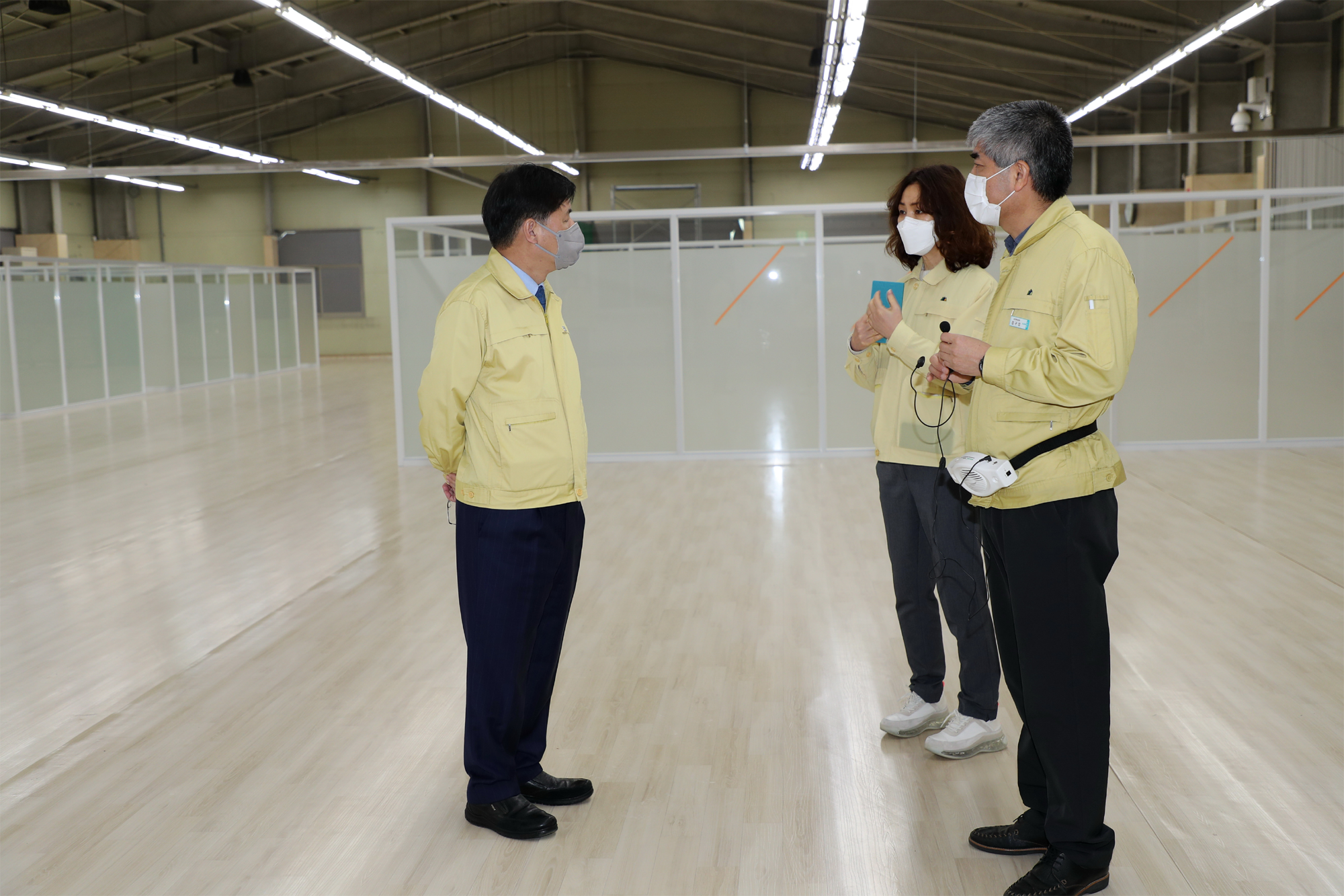 한대희 시장은 간부회의에 이어 접종센터 설치 공사가 진행중인 1, 2, 3체육관을 백신접종 동선에 맞춰 차례로 돌면서 체육관별 공간배치와 공사 상황 등을 점검하고 관계자들을 격려했다.