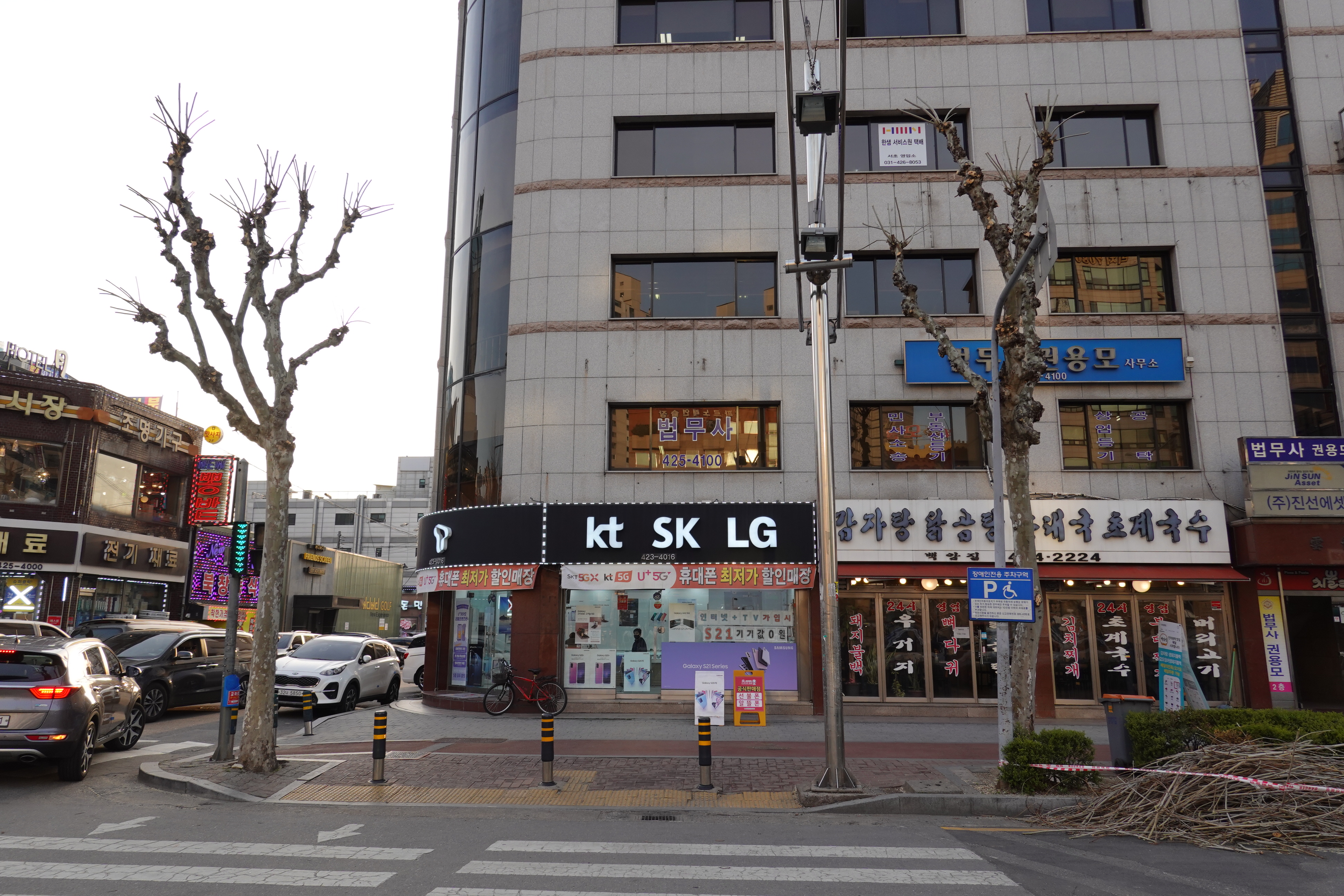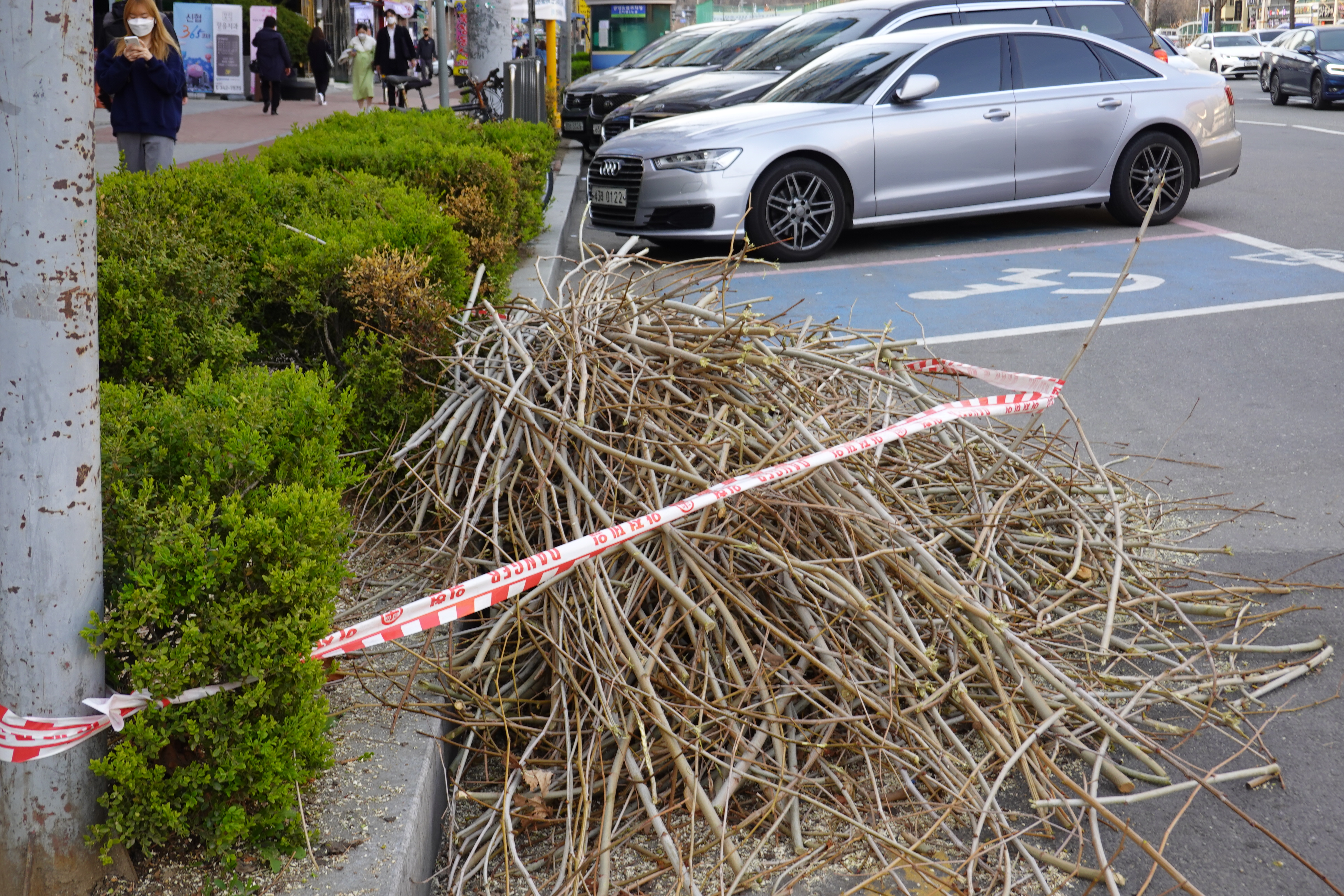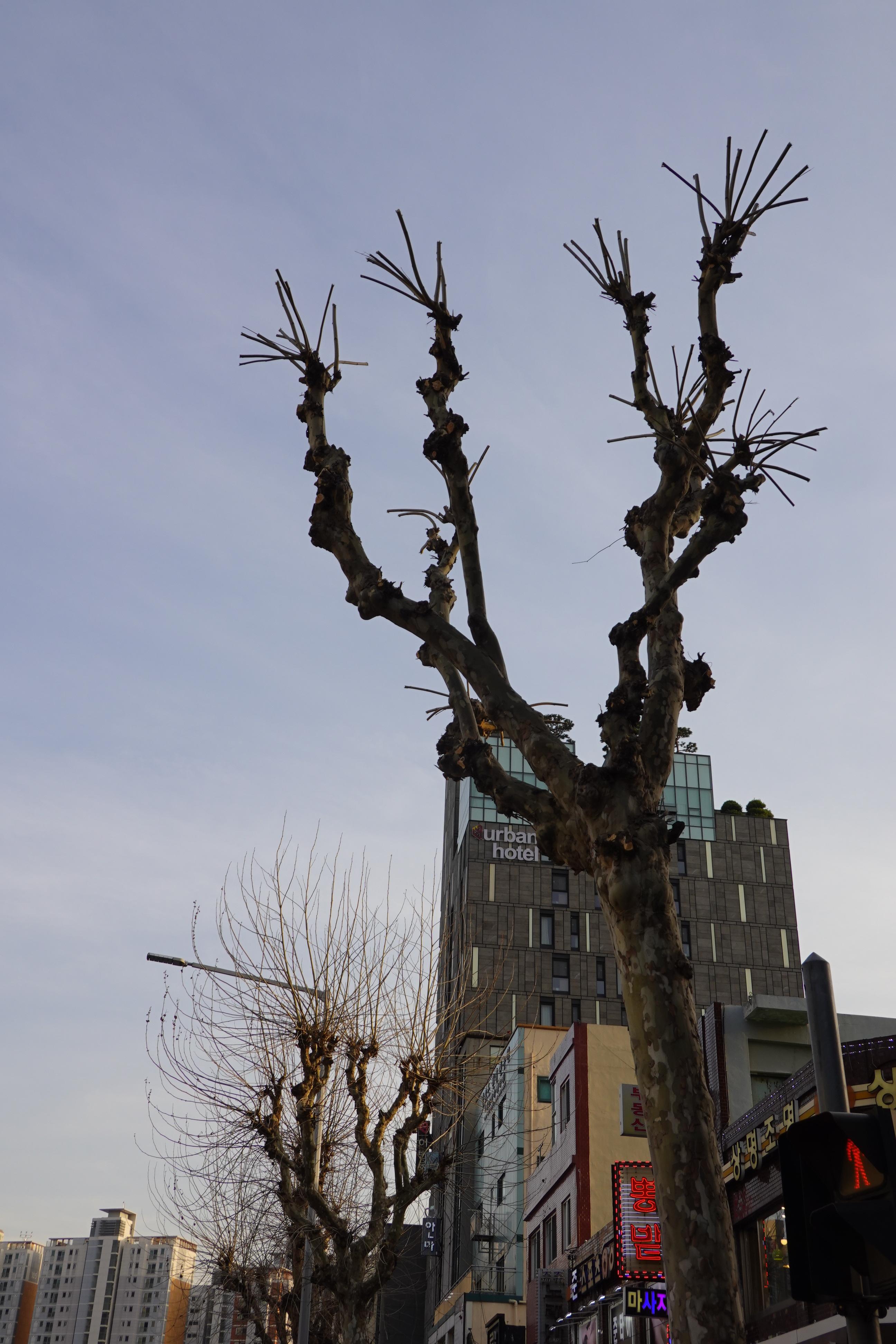 2021.03.31/ #안양 #동네 #골목 #가로수 #강전정/ 안양 인덕원 원통빌당앞 횡단보도 좌우 나무가 보기에 흉할 정도로 가지치기(강전정)를 당했다. 주변의 다른 나무는 손대지 않고 횡단보도 한쪽만 심하게 강전정을 했을까...