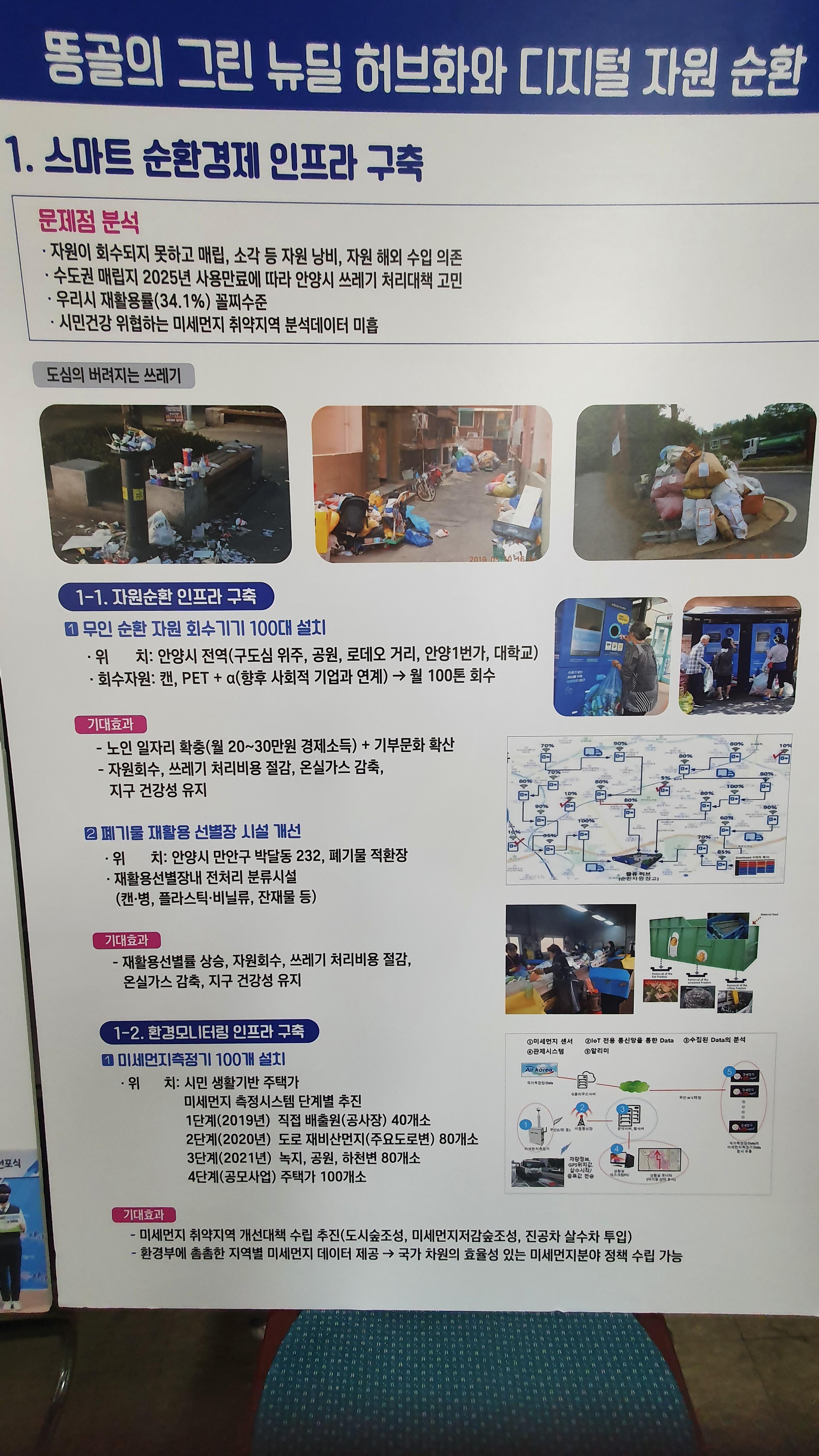 시의 스마트 그린도시 사업은 석수동의 구 분뇨처리장(구 지명 똥골)을 리모델링, 그린 뉴딜 허브공간을 조성하는 것을 비롯해 △ 안양시 전역 무인 순환 자원회수기기 100대 설치 △ 재활용선별장 시설개선 △ 주택가 미세먼지 측정시스템 설치 등 도시의 녹색전환을 위한 그린 인프라 구축이 핵심이다.