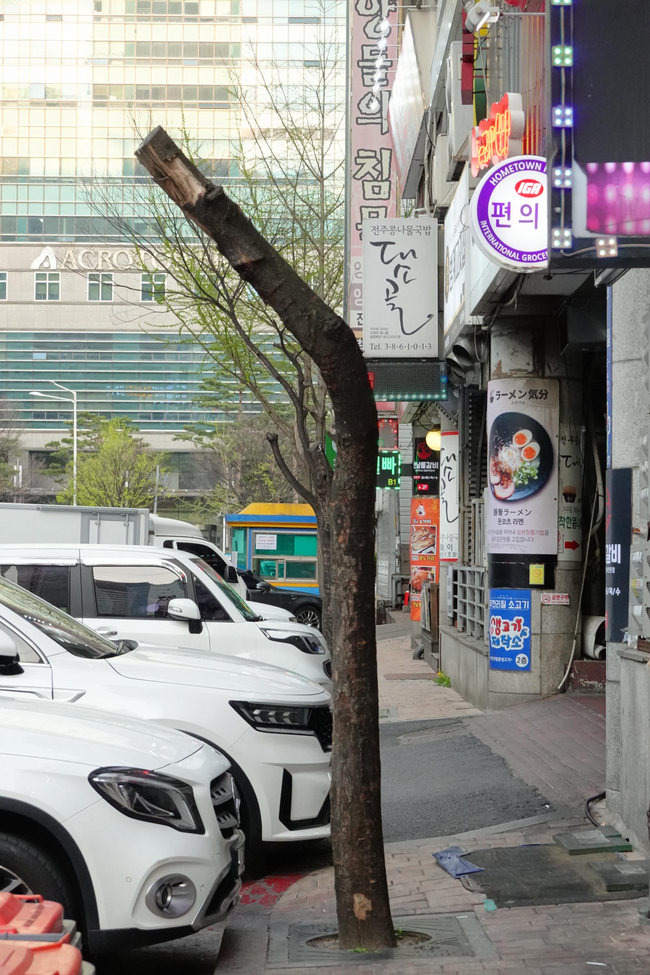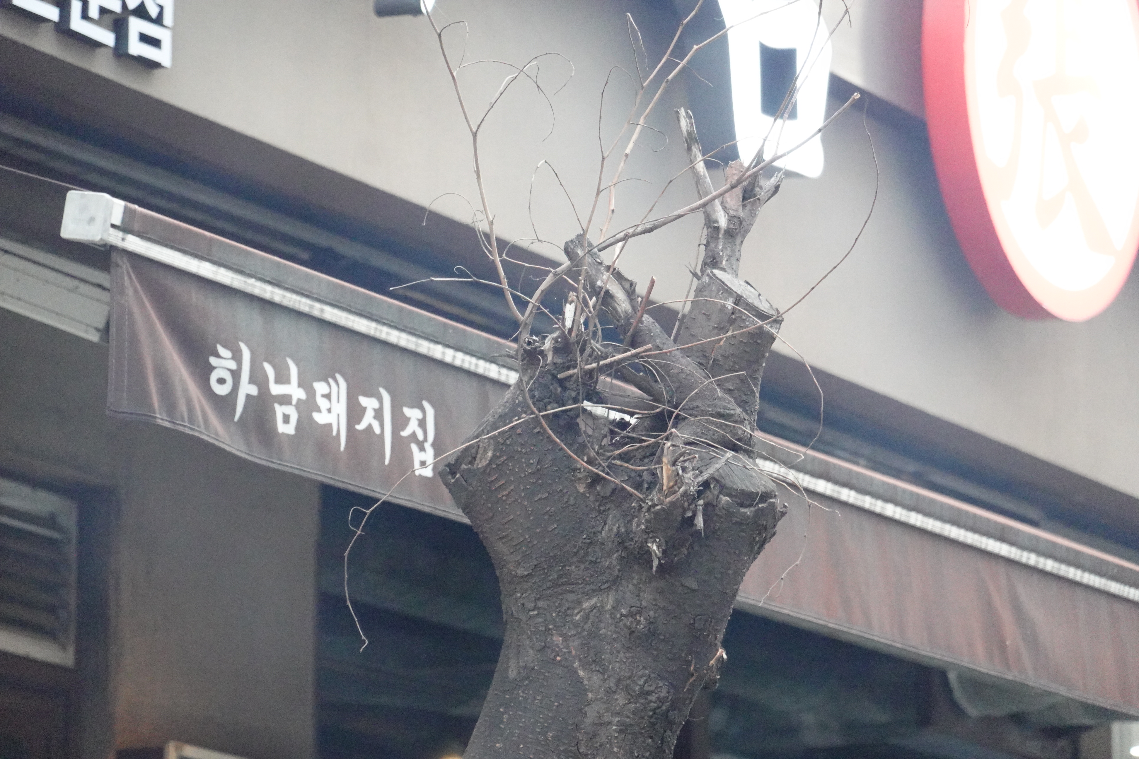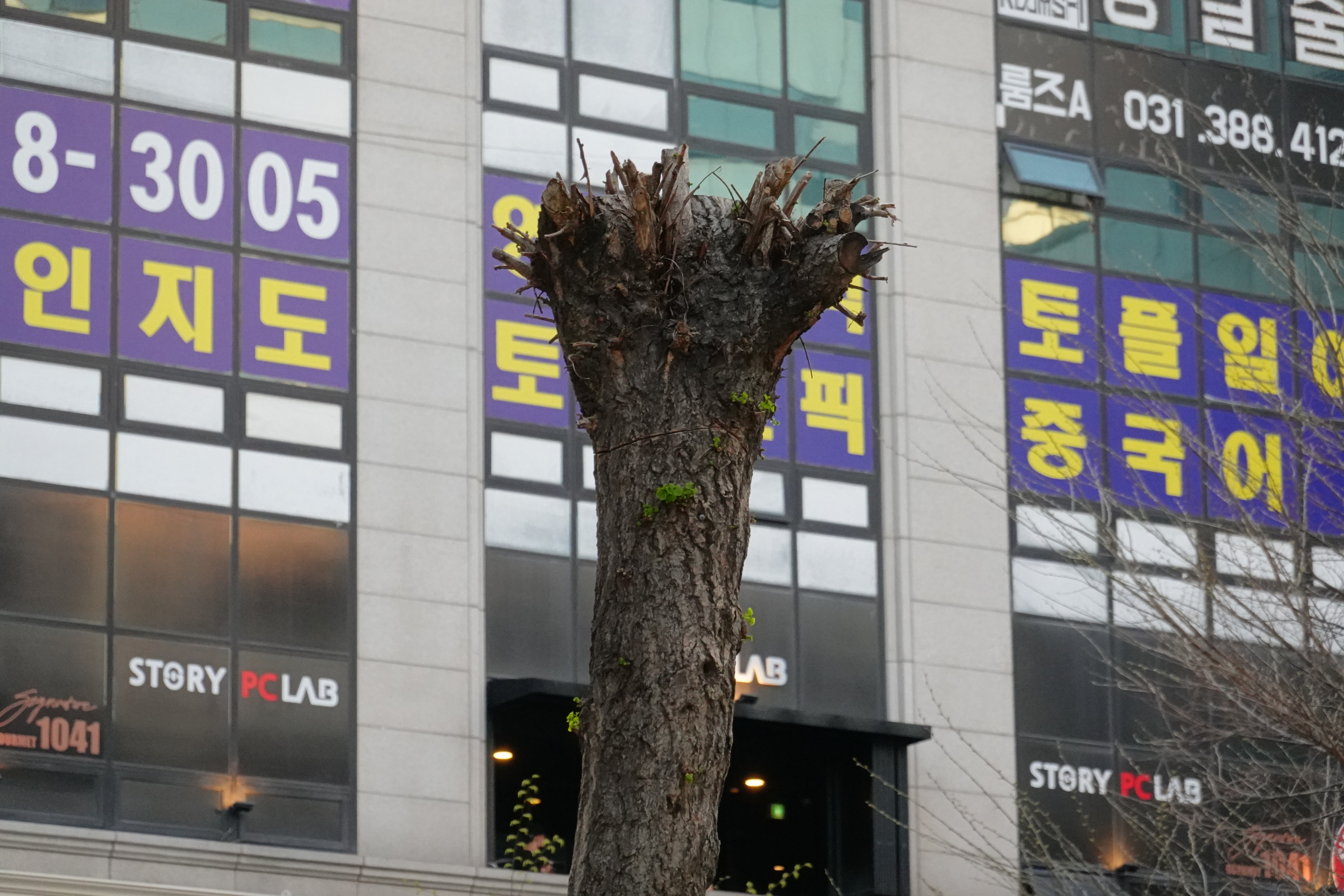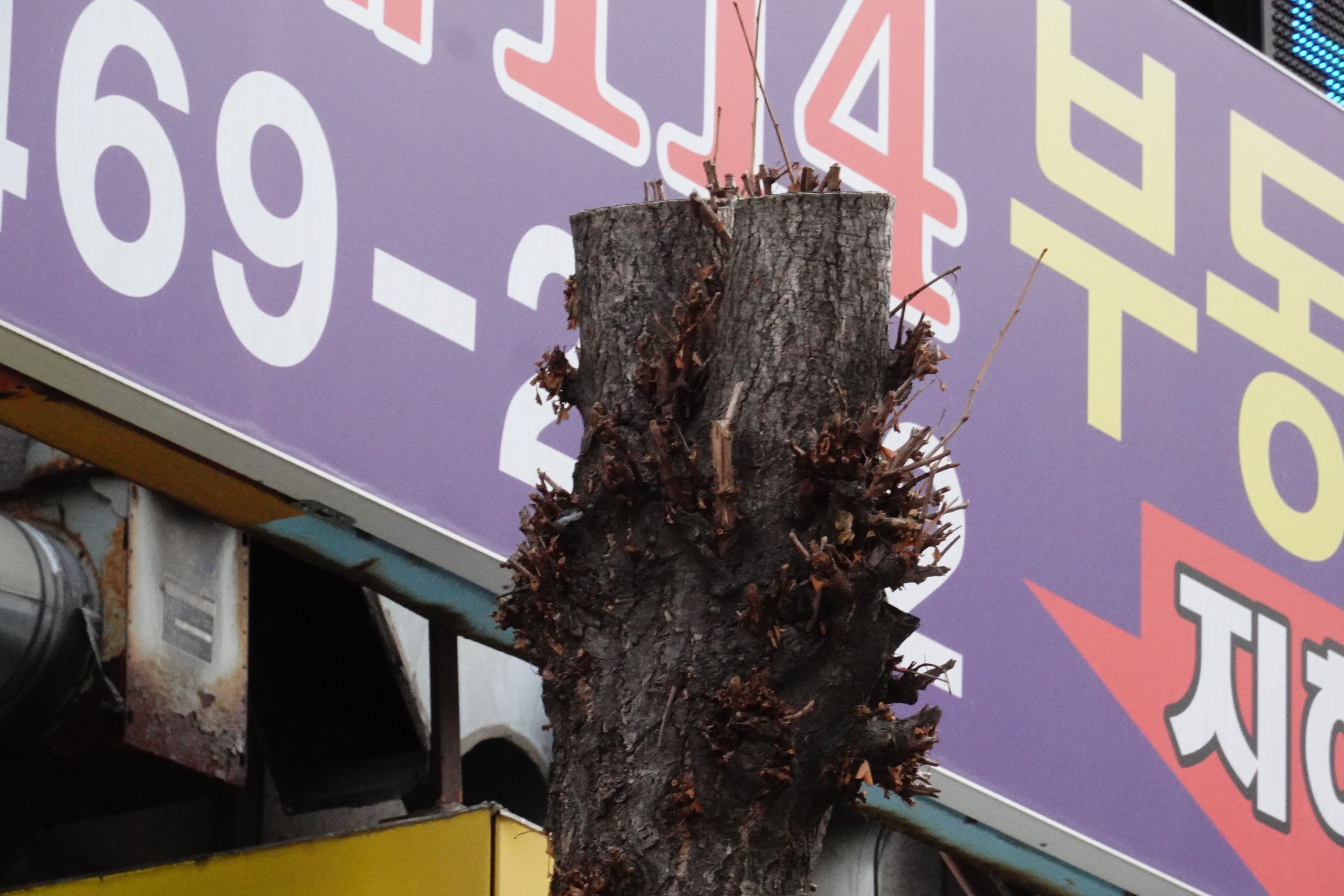 특히 이미 가지치기를 당한 안양 범계역 앞 인도 양쪽 상가 가로수들은 몰꼴이 아주 처참하다. 곁가지는 물론 가로수 몸통의 끝까지 뭉툭하게 잘라 마치 전봇대를 연상케헤 할 만큼 잘려나갔기 때문이다.