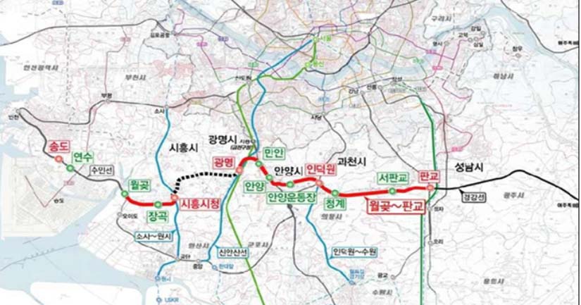 ‘월곶~판교 복선전철’ 건설사업은 국토교통부에서 시행하는 사업으로, 시흥시 월곶에서 광명, 안양, 의왕 등을 거쳐 성남시 판교까지 약 40㎞ 구간을 연결하는 것이 골자다.