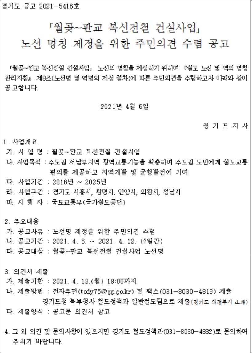 ‘월곶~판교 복선전철’이 수도권 남부 지역 간 접근성을 강화할 수 있는 철도 인프라인 만큼, 이번 도민 의견 수렴을 통해 노선의 연계성이 잘 드러나는 노선명을 제정하겠다는 구상이다.