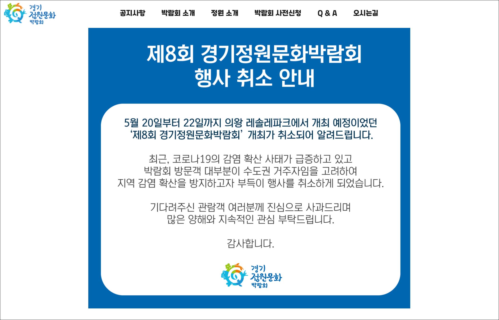 의왕시는 5월 20일부터 22일까지 3일간 레솔레파크에서 개최할 예정이었던 제8회 경기정원문화박람회 행사를 취소하기로 최종 결정했다고 20일 발표했다.