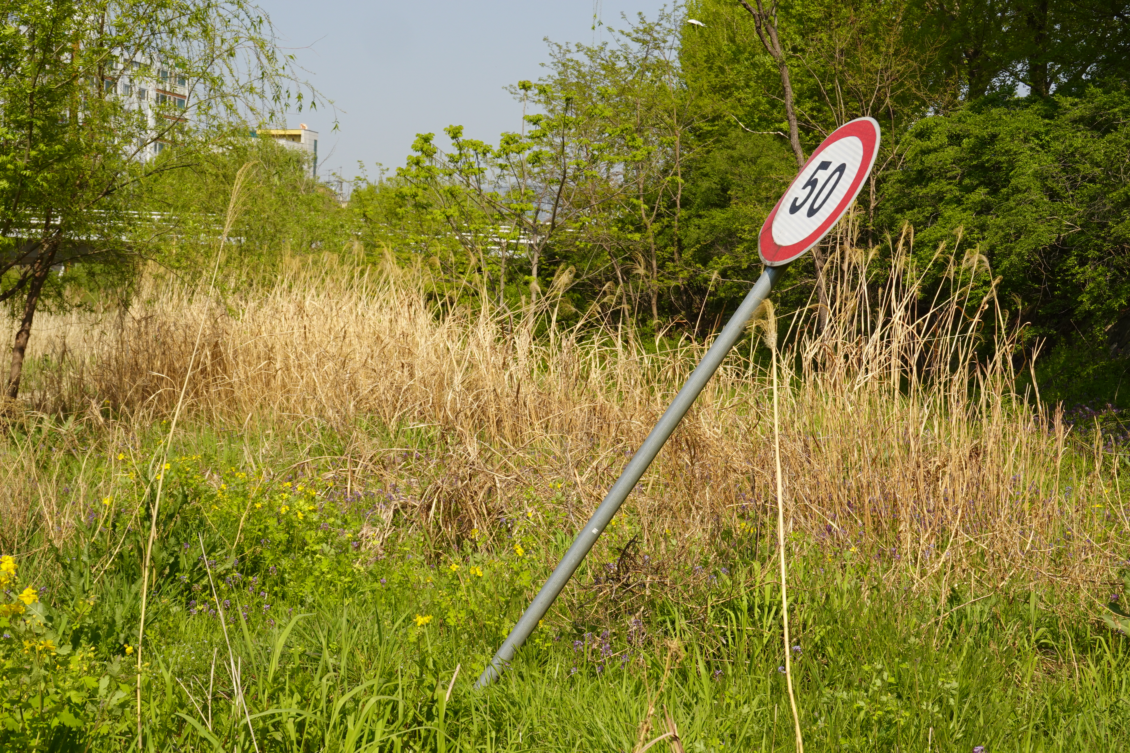 2021.04.19/ #안양 #동네 #하천/ 학의천 우안 흙길 산책로에 왠 속도제한 표지판. 대체 누가 갖다가 꽂아 놓았을까. 지난 여름 수해때 상류에서 떠내려왔나? 위치: 대한교에서 동안교 가는 학의천 우측길에...