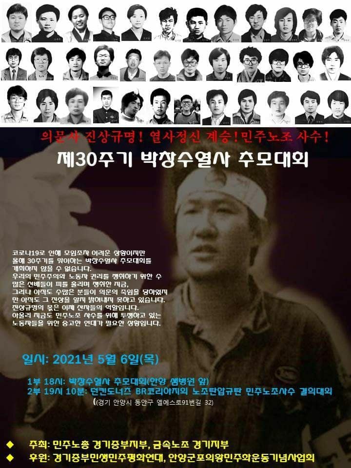 민주노총경기중부지부, 금속노조경기지부, 경기중부민생민주평화연대, 안양군포의왕민주화운동기념사업회는 5월 6일 오후6시 안양 샘병원앞에서 ‘故 박창수 노동열사의 30주기 추모행사'를 개최한다.