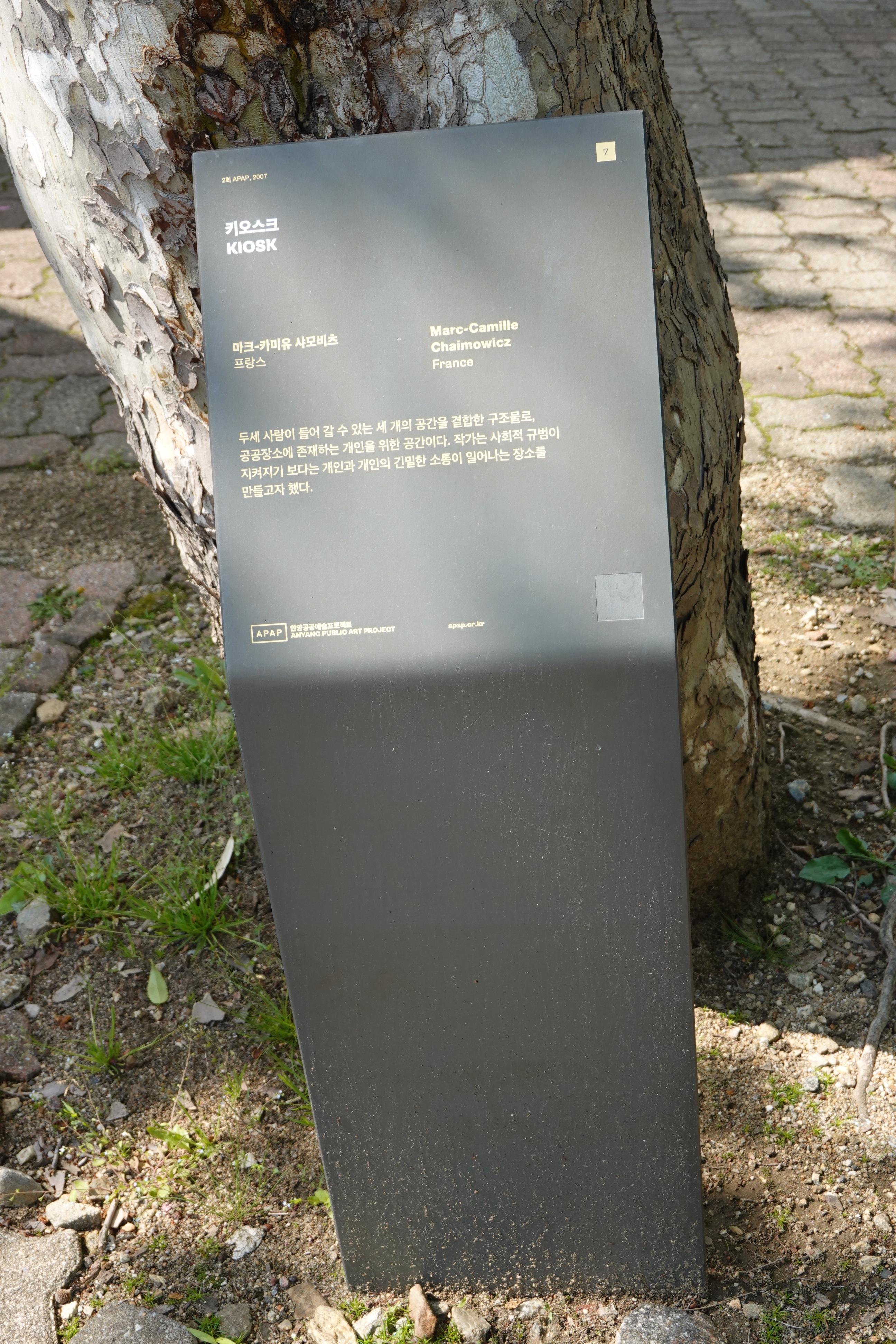 마크-카미유 샤모비츠 / Marc-Camille Chaimowucz의 작품 <키오스크>는 두 세 사람이 들어갈 수 있는 구조물로, 작가가 1994년 사회 속의 한 개인을 위한 구조물을 만들고자 합판으로 제작했던 모형에 기초한다. 작가는 2회 APAP를 위해 모형 세 개를 나뭇잎 모양으로 결합하고 노출 콘크리트로 제작할 것을 제안했다. 큰 길에서 조금 벗어난 곳에 위치한 <키오스크>는 공공 장소에 존재하는 개인을 위한 공간이며, 사회적 규범의 피상성이 드러나며 개인과 개인의 긴밀한 소통이 발생하는 장소이고, 사회 속에서 개인의 자리를 지속적으로 재형성하고 재구성하는 사회적 기능을 갖는 구조물로서 기획되었다. 작가는 공적인 영역과 사적인 영역, 예의와 무례, 형식적인 관계와 긴밀한 관계 등 사회적 규범의 경계를 탐구하며, 사회 속에서 한 개인을 위한 자리, 나아가 사회 속에서 예술의 형식과 기능에 대한 질문을 제기해왔다.