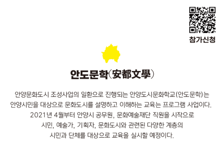 ‘안도문학’은 안양도시문화학교의 준말이다. 안양시민을 대상으로 하는 문화도시 교육프로그램 사업이며, 안양 문화도시 조성에 대한 시민들의 이해와 공감대 형성을 목적으로 한다.