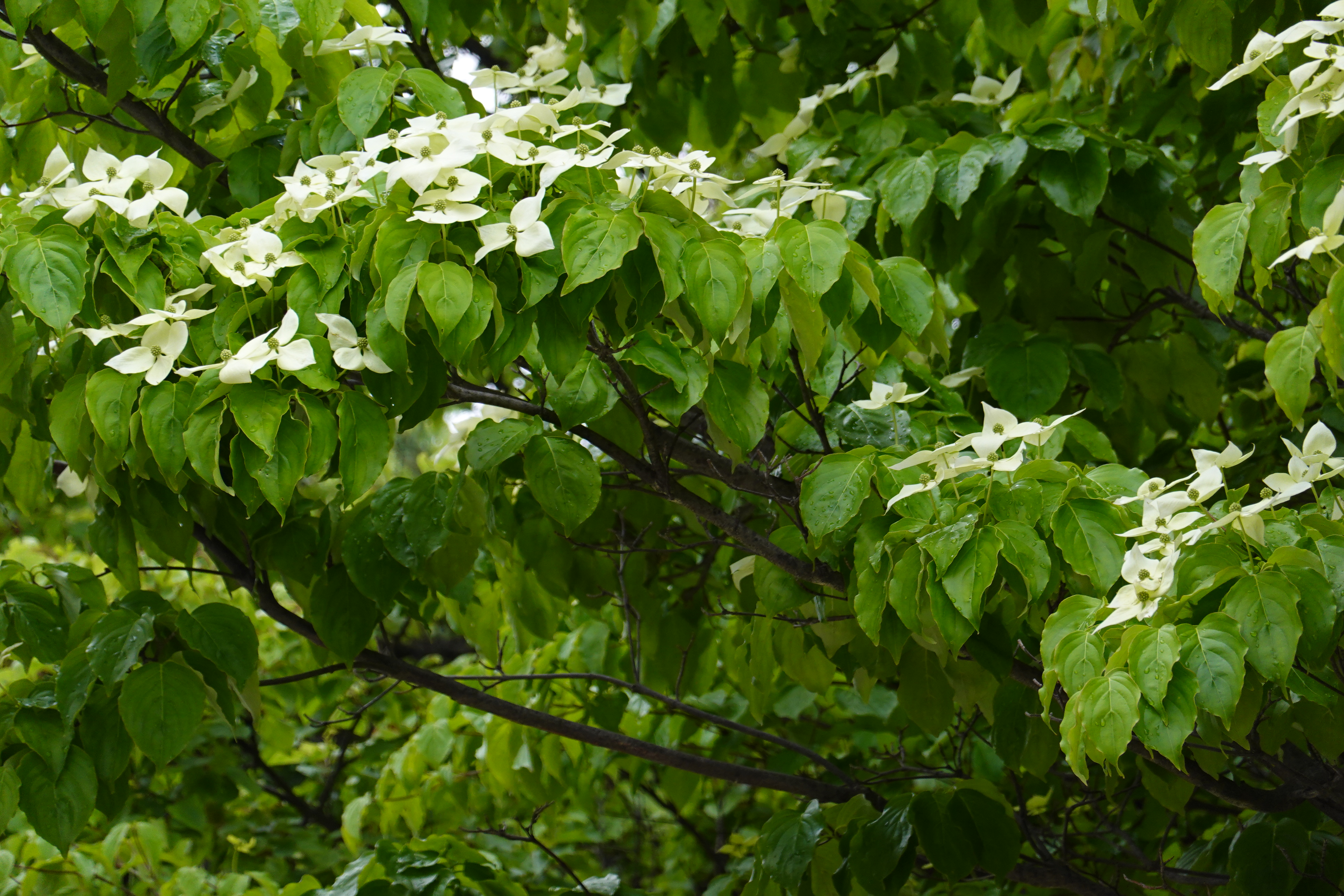 하늘을 향해 나비처럼 날개를 펴는 산딸나무는 멀리서도 알아볼 수 있다. 하얀 꽃송이들이 무리지어 층층이 피는 모습이 아름답다.