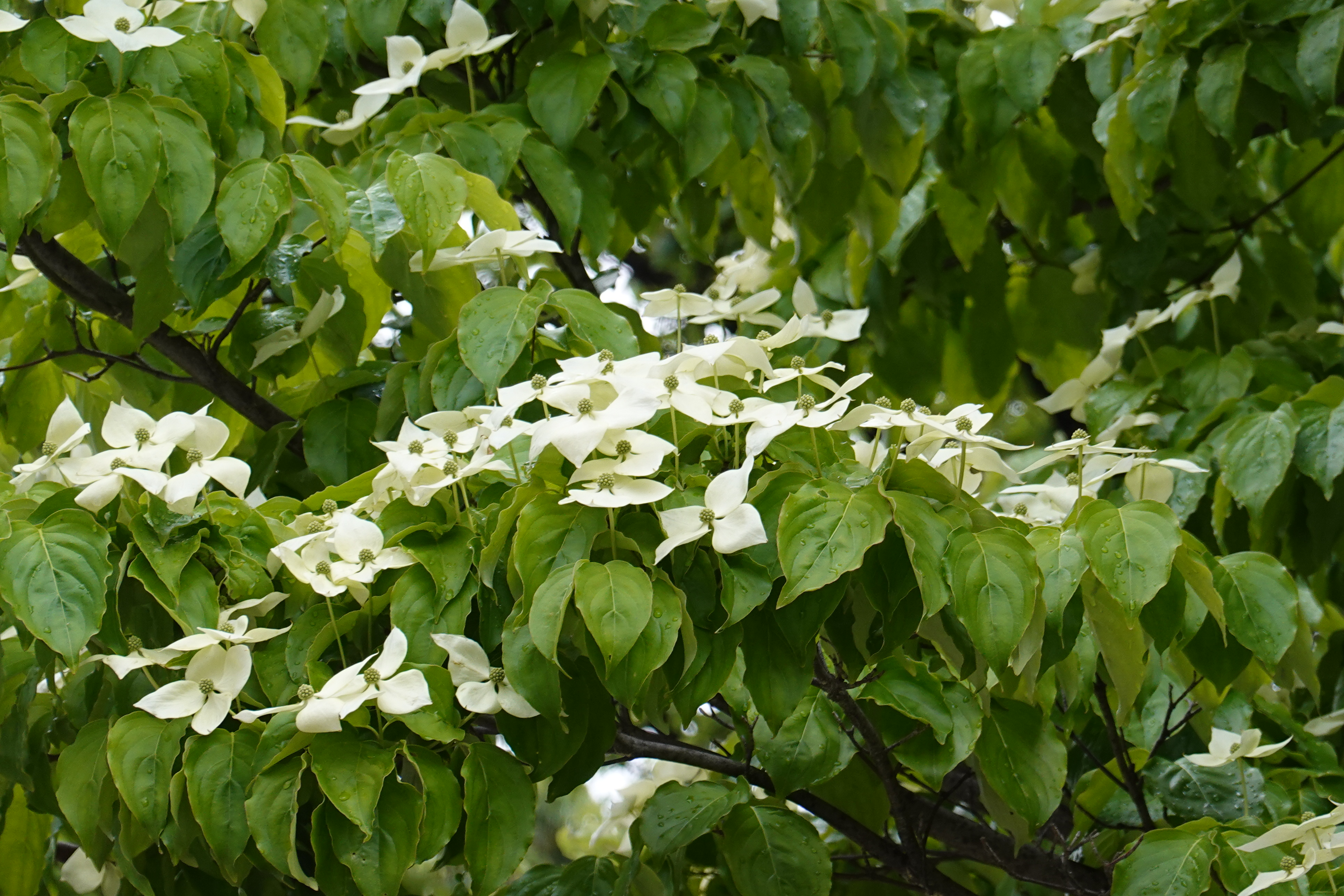 하늘을 향해 나비처럼 날개를 펴는 산딸나무는 멀리서도 알아볼 수 있다. 하얀 꽃송이들이 무리지어 층층이 피는 모습이 아름답다.
