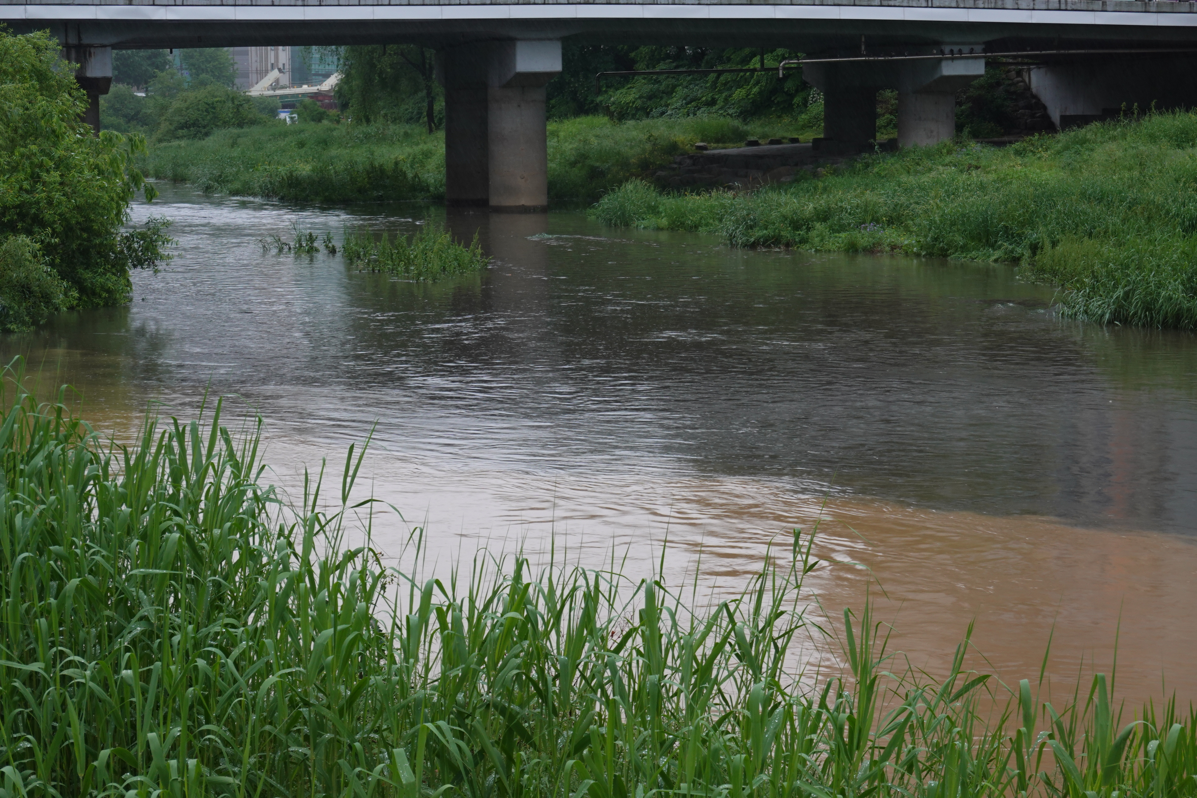 2021.05.16/ #안양 #동네 #하천 #쌍개울/ 안양천과 학의천의 합류지점인 쌍개울. 두가지색의 냇물이 만난다. 맑은 물이 내려오는 안양천과 달리 황토물이 내려오는 학의천. 과천 갈현지구 개발로 인한 흙탕물이 갈현천으로 유입돼 학의천을 거쳐 내려오는듯 싶다...