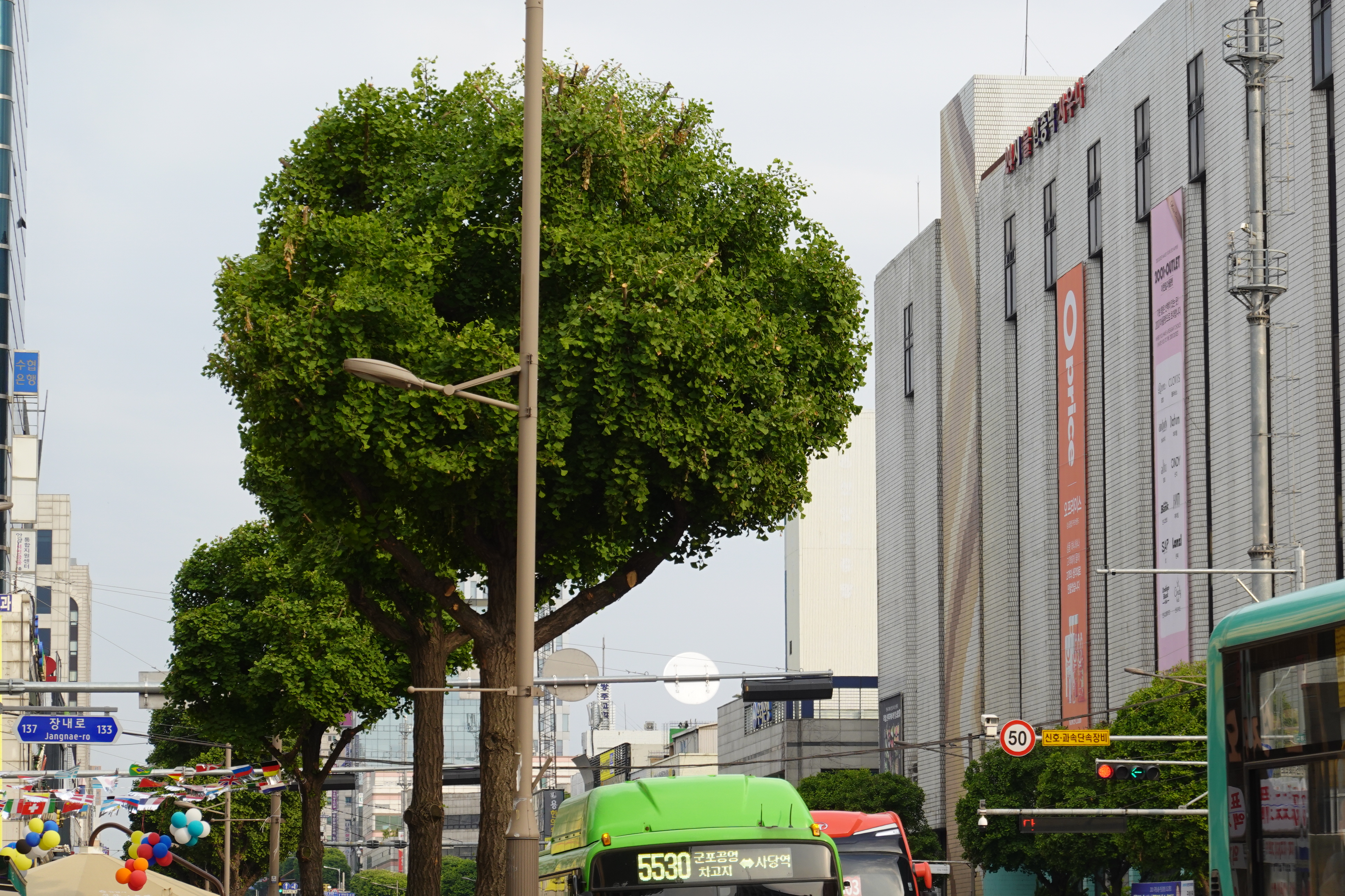 2021.05.30/ #안양 #동네 #가로수 #나무 #둥근원가로수 #전정작업/ 안양시 만안구 안양로에 심어진 은행나무 가로수들이 공 모양으로 다듬는 전정작업을 통해 원형 디자인 가로수로 탄생했다. 안양시의 이번 전정작업은 안양8동 군포시계부터 석수2동 연현오거리까지 안양로의 양방향 6km구간에 심어진 은행나무 가로수 712그루로 둥근 원형디자인의 전정작업 결과 일단 불규칙적인 종전의 모습과 달리 일단 정돈되고 질서정연함이 묻어난다.