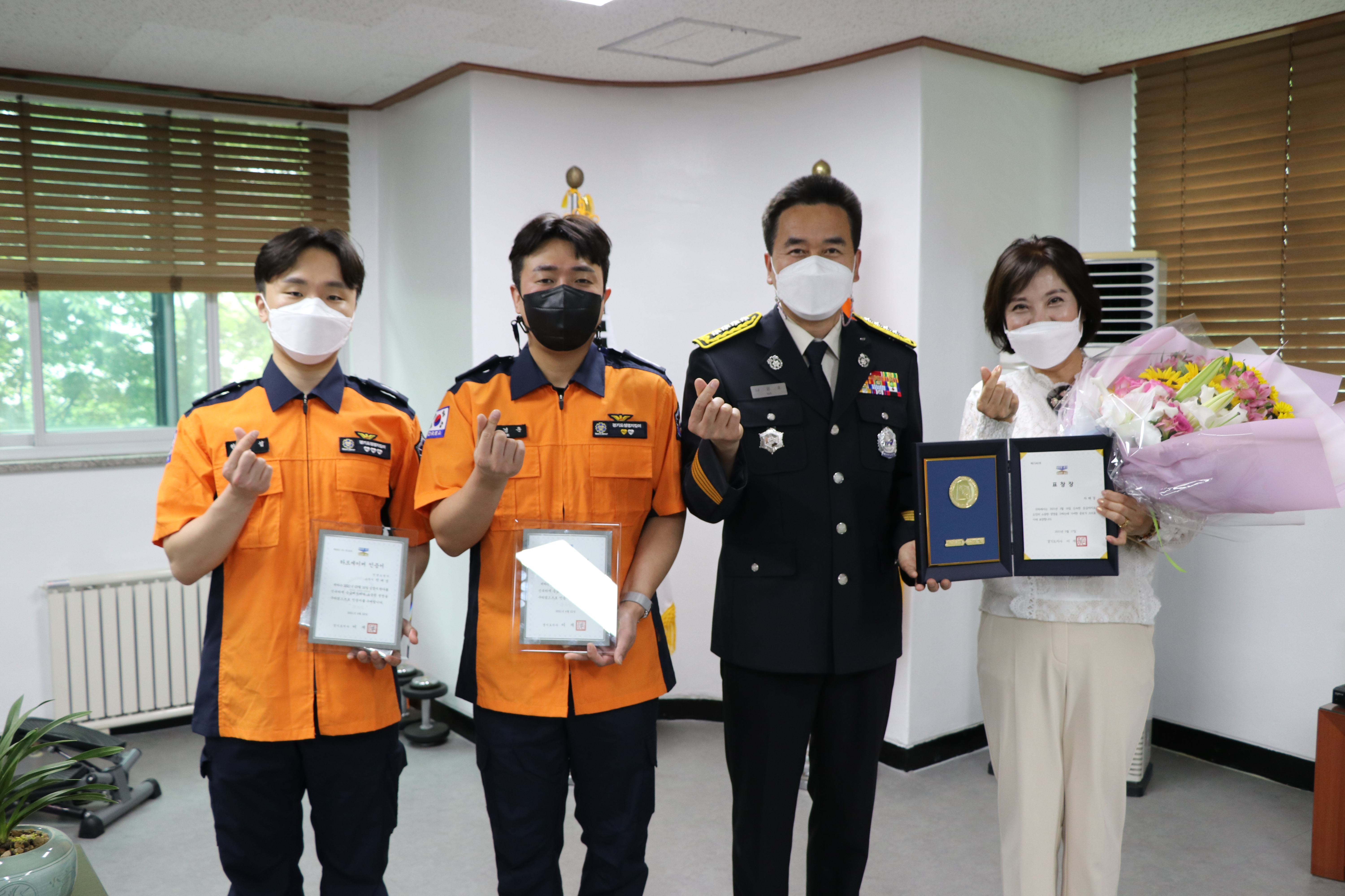 안양소방서가 적절한 응급처치를 통해 심정지 환자의 소생에 기여한 구급대원(소방장 이경훈, 소방사 한태섭)과 버스기사 차혜경 씨에게 하트세이버와 도지사 표창장을 수여했다.