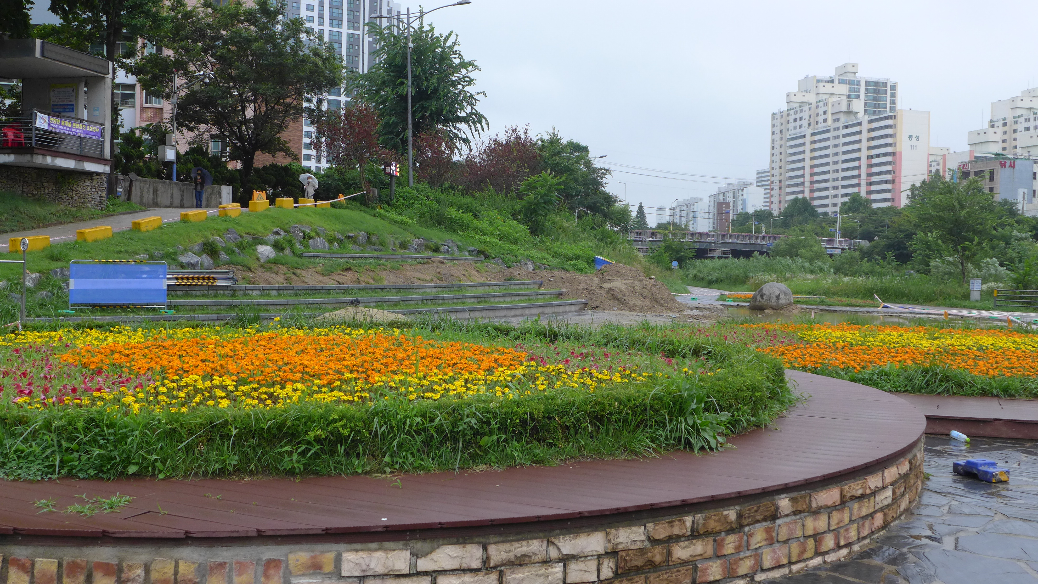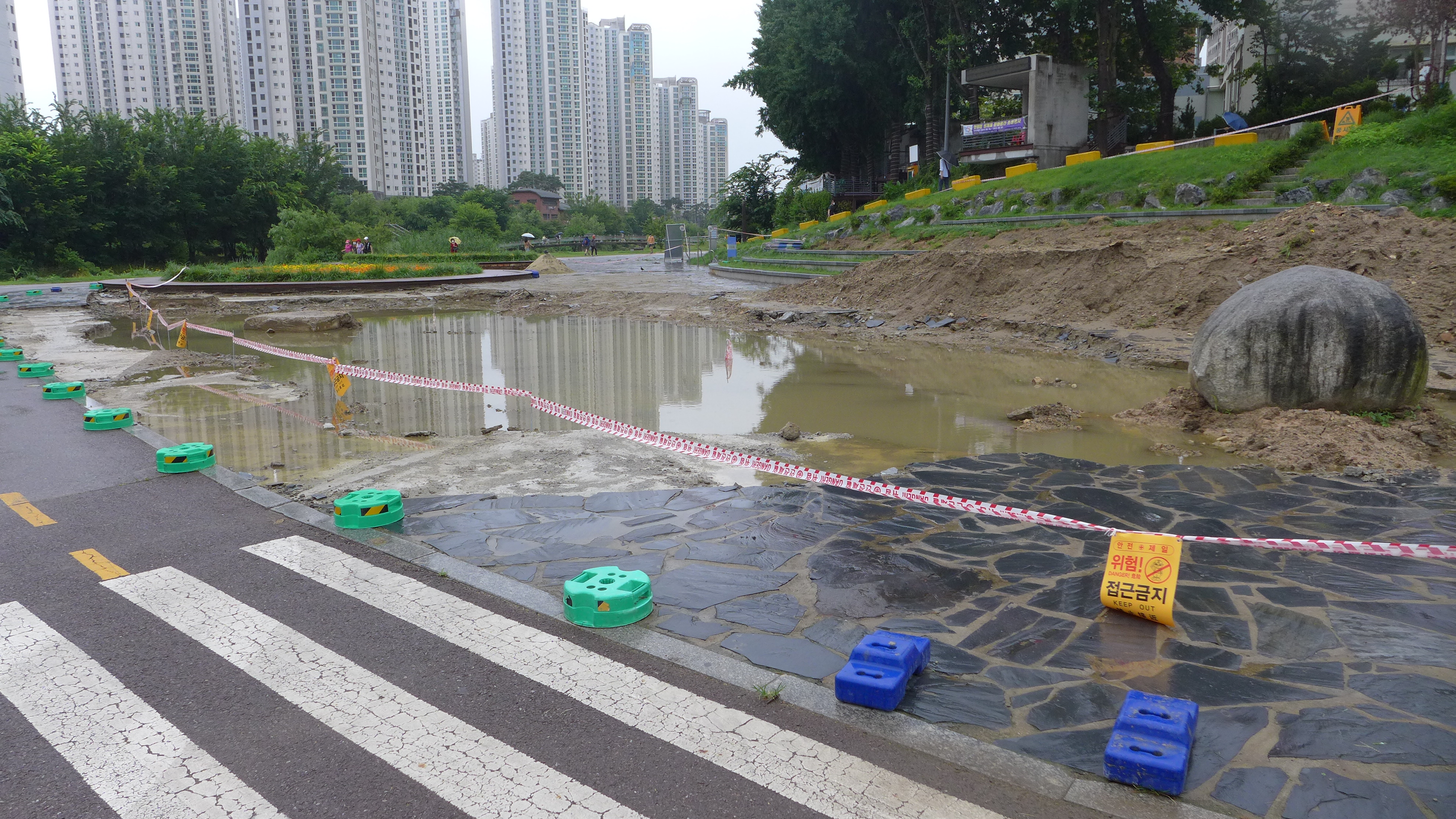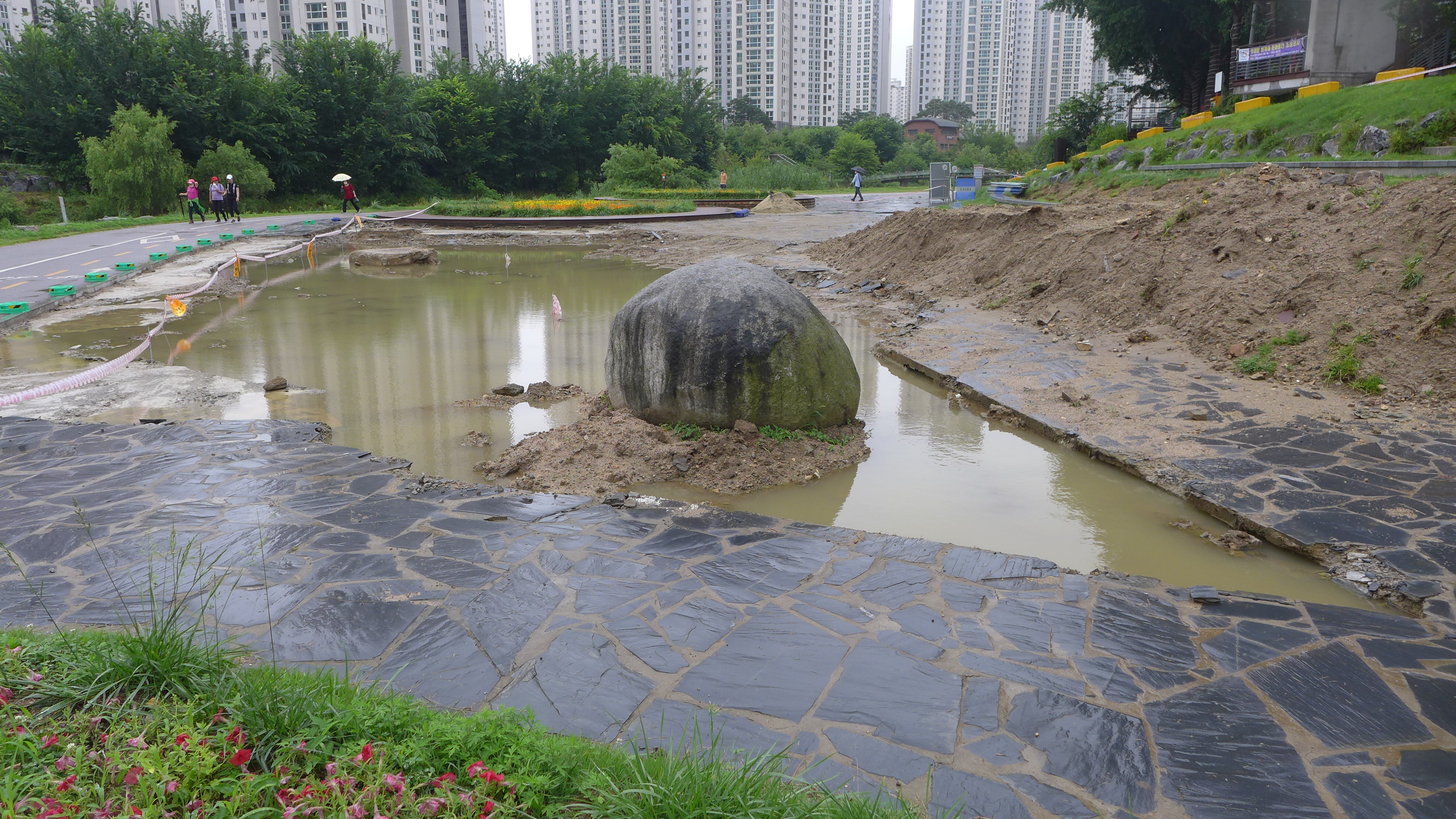 2021.07.04/ #안양 #동네 #마실 #쌍개울/ 장마가 시작된 첫날 4일 새벽 큰물이 지나간 흔적. 쌍개울 광장의 바닥 돌들이 모두 뜯겨져 어디론가 사라지고 커다란 물 웅덩이가 생겼다.