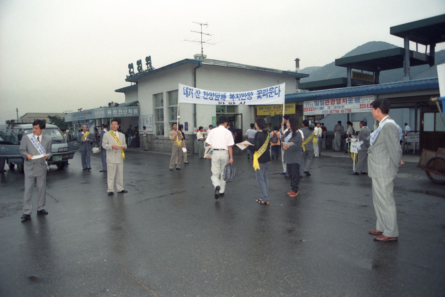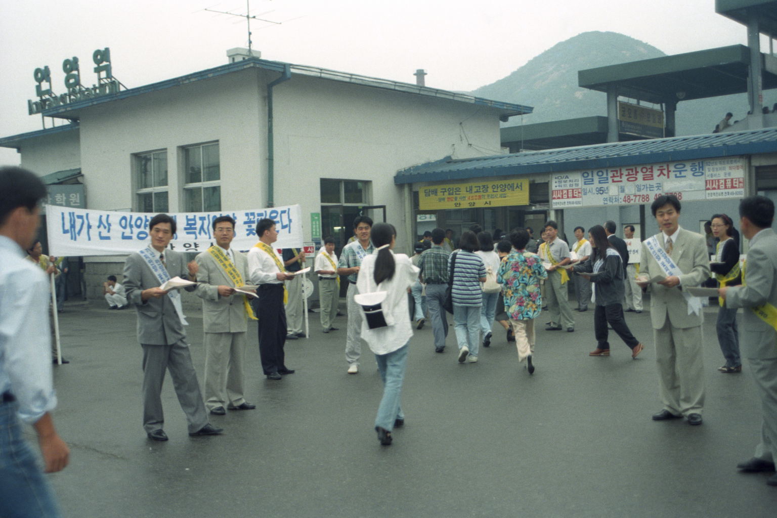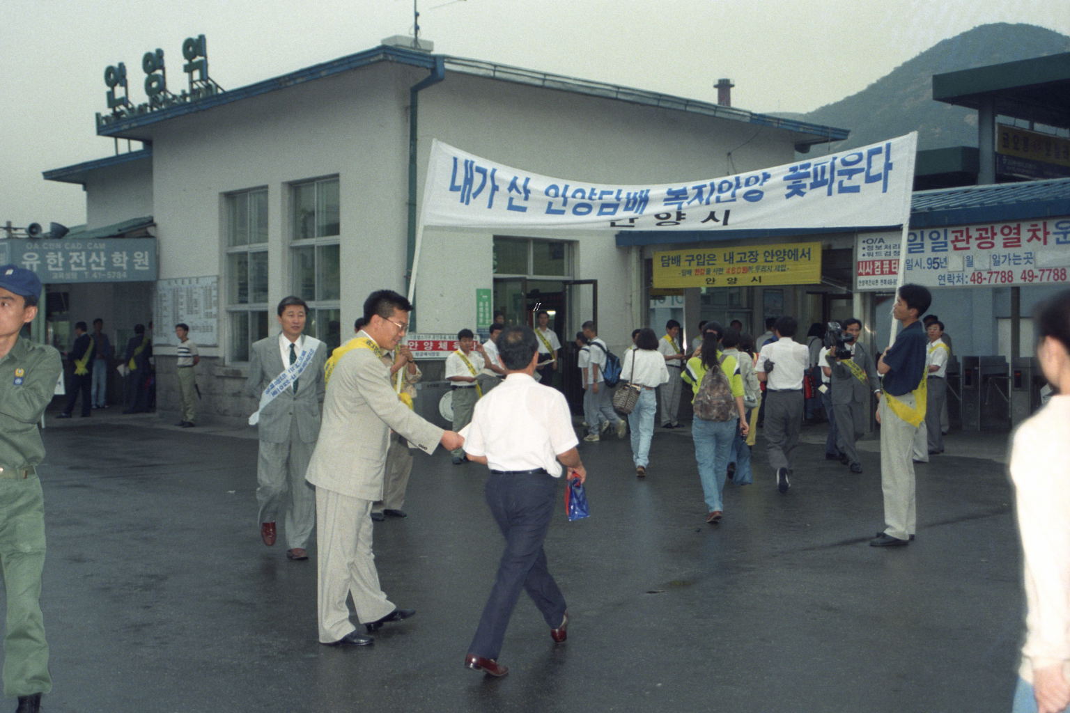 2021.10.14/ #안양 #옛사진 #기록 #기억 #안양역 #sine1995/ 안양역과 안양시 공무원들의 내고장 담배구입 홍보전/ 1995년의 안양역 풍경으로 안양시 공무원들의 내고장 담배를 구입해 달라는 홍보전이 이색적이다. 이는 담배 판매로 부과되는 ‘담배소비세’가 지방자치단체의 세수와 직결돼 있기 때문이다. 담배소비세는 지방자치제 시행을 앞둔 지난 1989년부터 지방세로 이양됐다. 각 시·군의 ‘알짜’ 재정수입이다. 이 때문에 시·군마다 앞다퉈 내고장 담배사기 운동을 전개했다. ‘내고장에서 담배를 구입하면 시세(市稅) 460원이 내고장 발전을 위해 쓰여진다’는 '내가 산 안양담배 복지안양 꽃피운다' 등 담배소비 권장(?) 현수막까지 버젓이 내걸고 홍보에 나섰다.