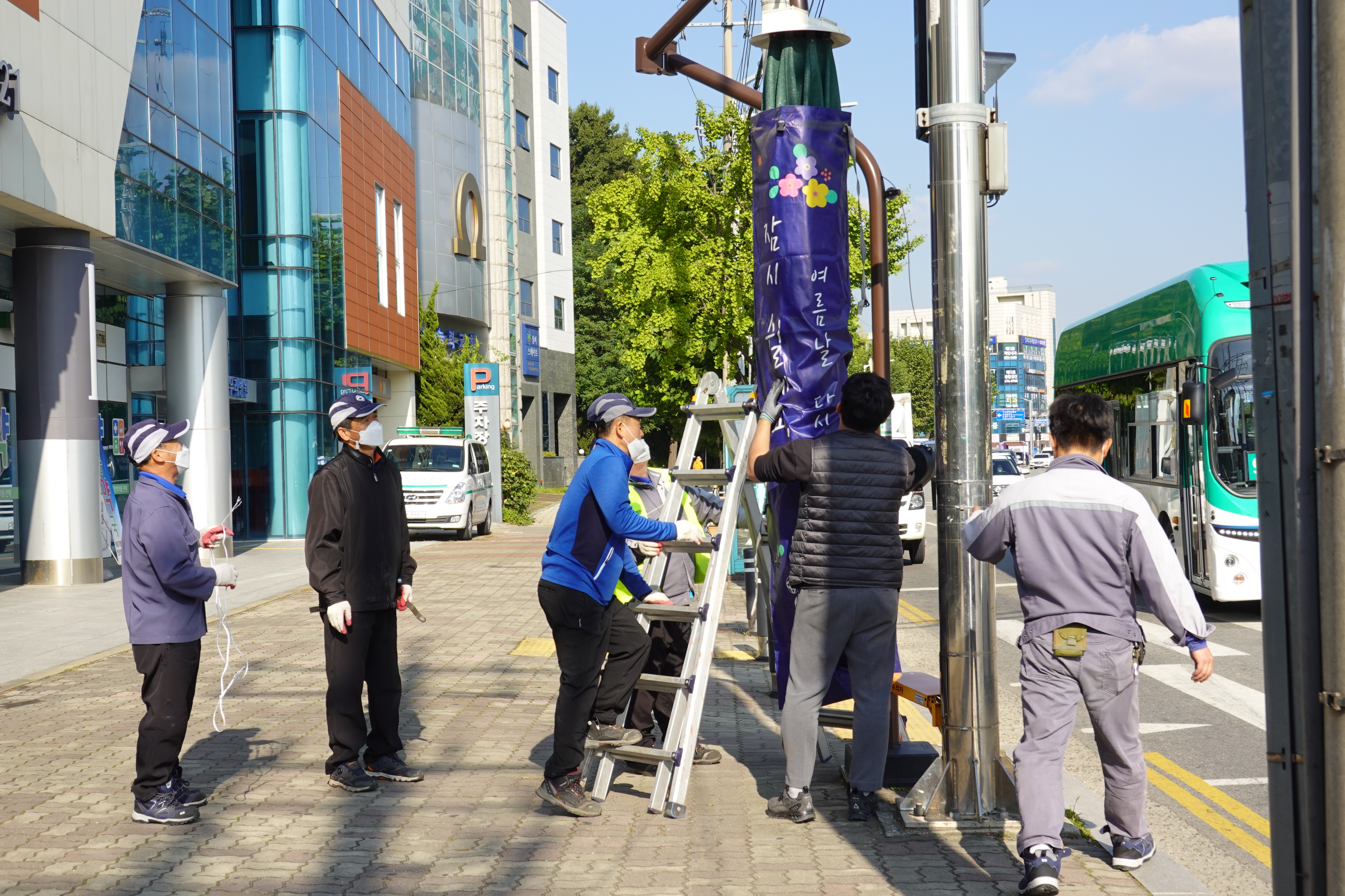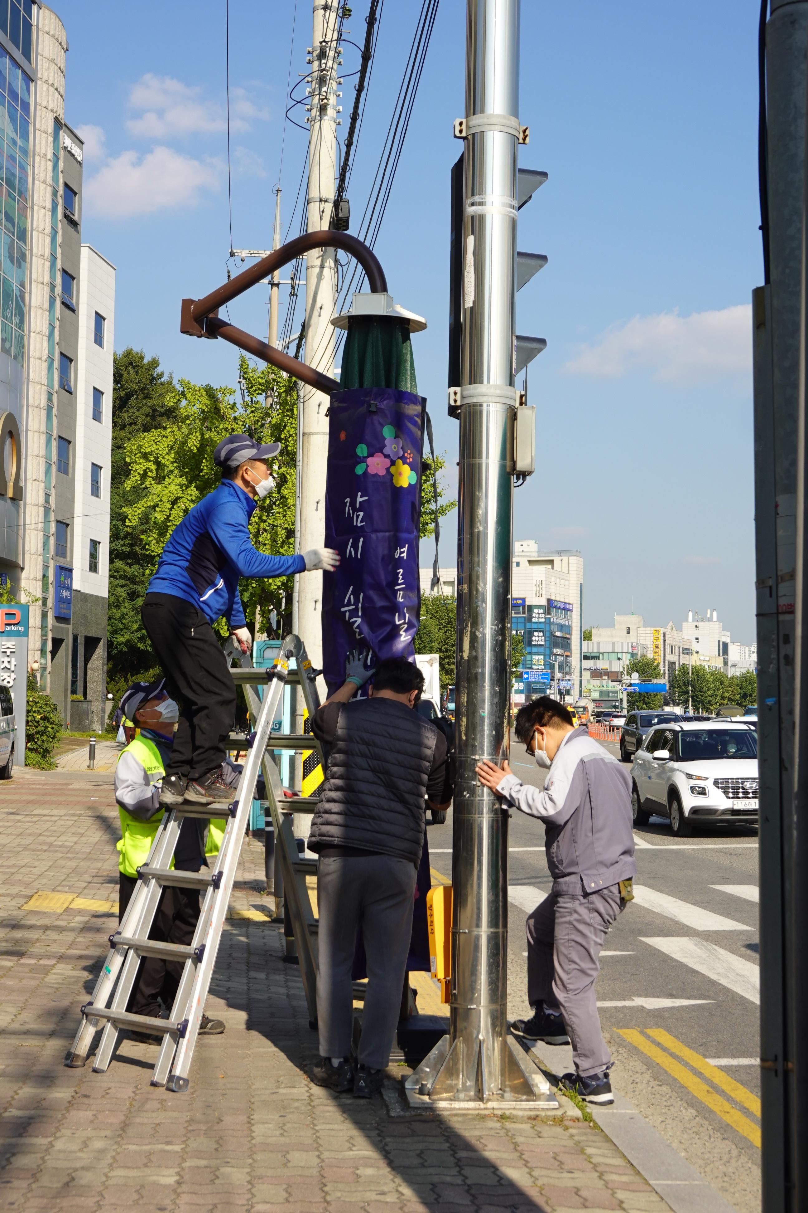 2021.10.20/ #안양 #도시 #대형파라솔 #잠시쉬어갈께요 #여름날다시만나요/ 무더웠던 여름철 따가운 햇빛을 가려주었던 거리 교차로와 황단보도에 설치된 대형파라솔이 겨울잠을 자기 위해 옷을 입고 있다. .... 안양 비산동에서