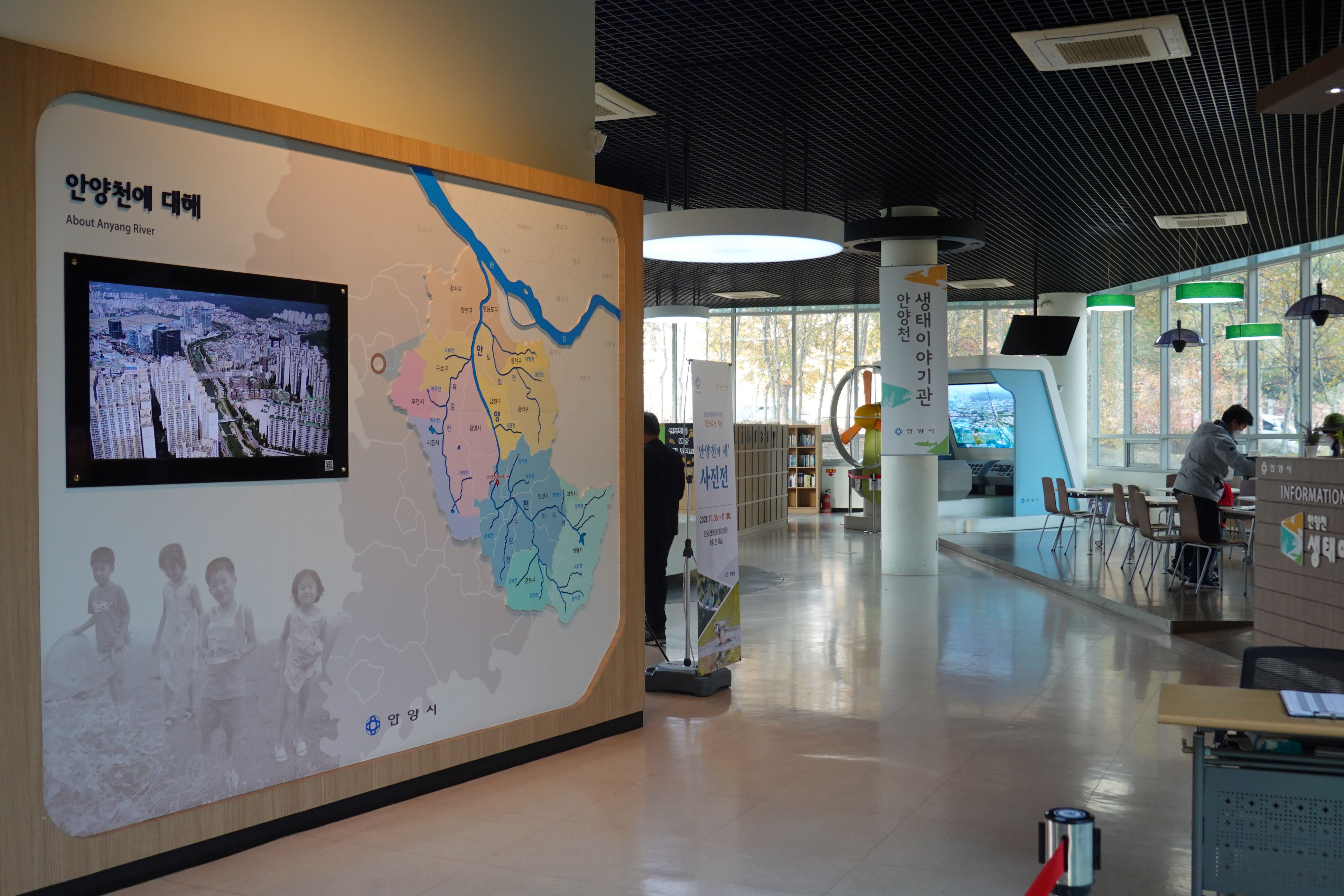 특히 산업화로 오염된 안양천과 하천을 되살리기 위한 과정, 깨끗하게 복원된 환경에서 인간이 공존하는 이야기를 기록에 담아 하천 생태의 소중함을 전하고 있다. 시설은 5천㎡ 대지에 연면적 1천500㎡의 지상2층 규모로 하천 환경 교육을 할 수 있는 전시관, 3D홍보관, 생태하천 배움터, 안양천 라운지, 조류전망대·관찰대 등이 들어섰다. 1층 전시관에는 버들치, 피라미, 얼룩동사리 등 안양천의 물고기 15종이 놀고 있는 수족관이 설치됐고 조류관, 양서갑각류관, 곤충관, 식물관 등이 다양한 생태계 복원성과를 자랑한다. 전시관 2층 안양천의 역사를 담은 전시실에는 조선 정조 시대 능행차를 위해 설치한 만안교와 50년대 미역 감고 뱃놀이 하던 맑은 안양천을 보여준 뒤 70년대 공장 폐수로 죽음 직전에 이른 오염 실태가 숨김없이 전시됐다. 이어 90년대 시와 시민들이 연대한 안양천살리기기획단을 발족하고 하수종말처리, 자연형하천 조성 등 힘겨운 과정을 거쳐 생태계가 살아나며 시민 품으로 돌아온 도심하천을 이미지와 사운도, 그래픽을 지원한 첨단장비로 입체적으로 보여준다. 2002년 안양천에 참게가 돌아오고 2003년 버들치와 숭어, 2004년 물총새, 2006년 맹꽁이에 이어 2007년 원앙이 관찰된 사실도 사진과 모형 자료로 전해주고 있다. 이와함께 30명 관람 규모 3D영상관에서는 개구쟁이 푸름이가 버들치로 변해 안양천을 오르내리며 물 속 생태계를 관찰하고 개구리를 만나 위협을 느끼며 환경의 소중함을 깨달아간다는 입체영화 ‘마법에 걸린 푸름이’가 상영돼 어린이들의 관심을 끈다.