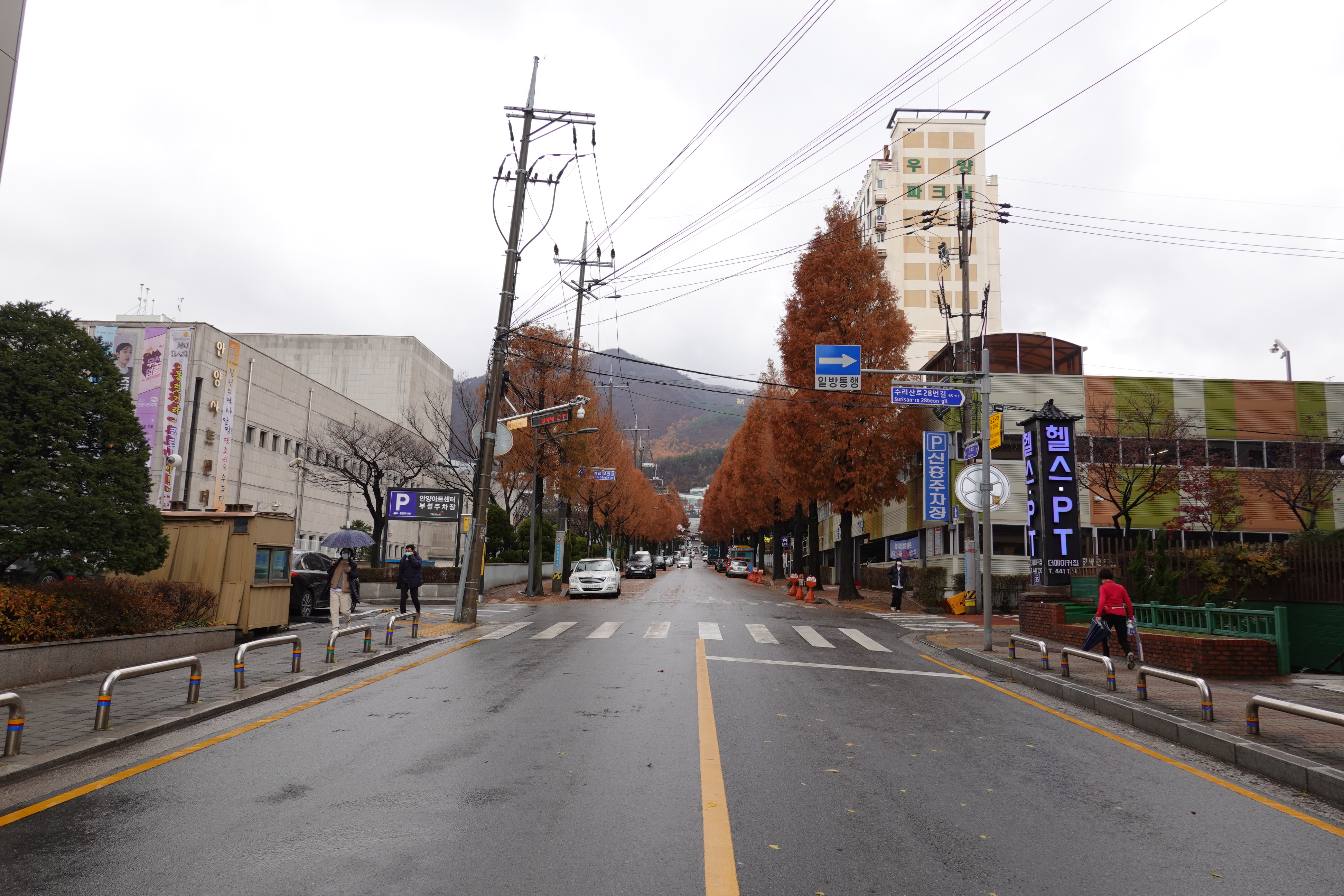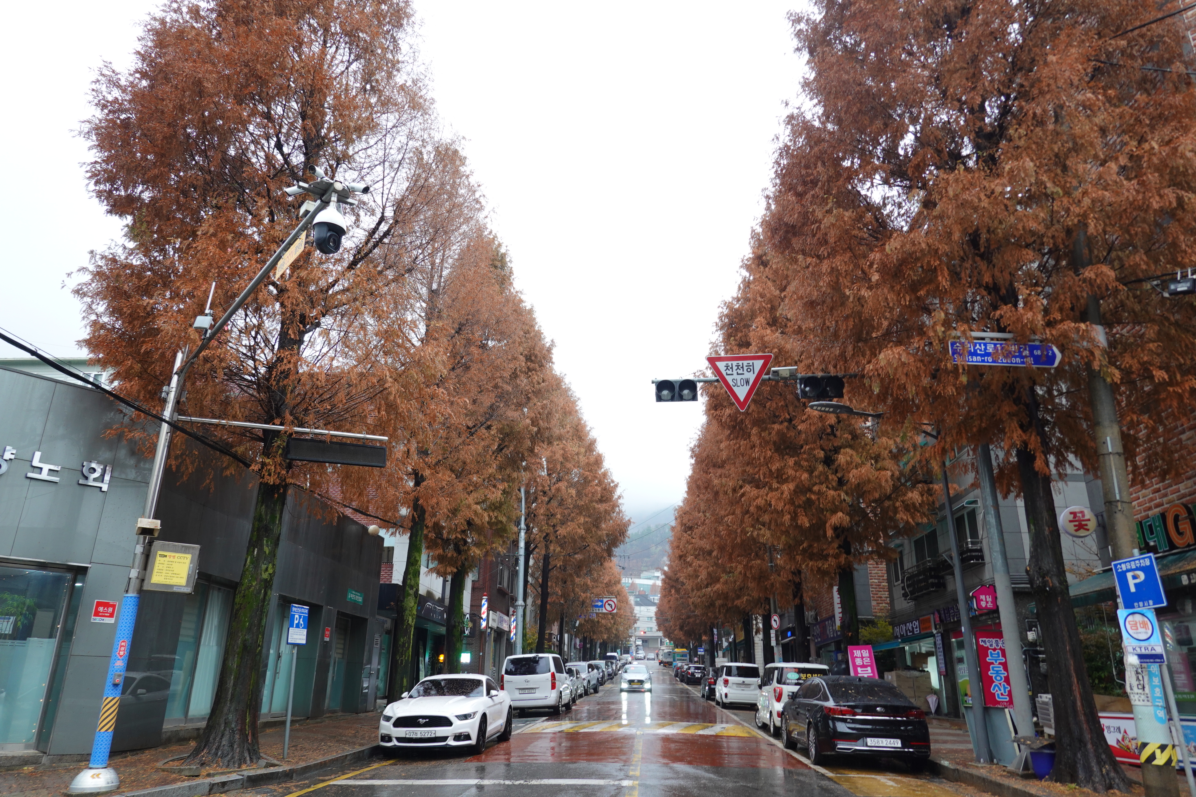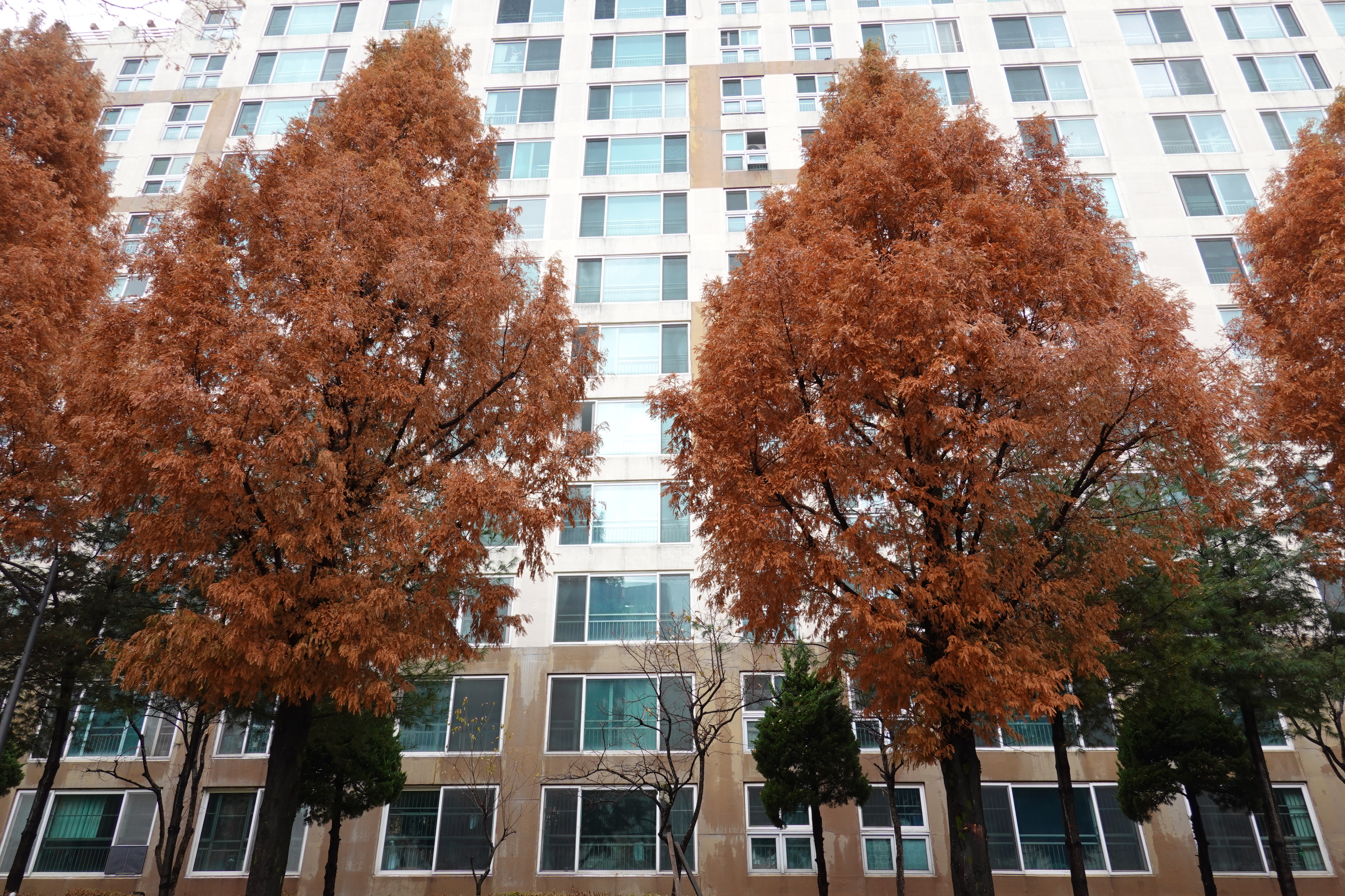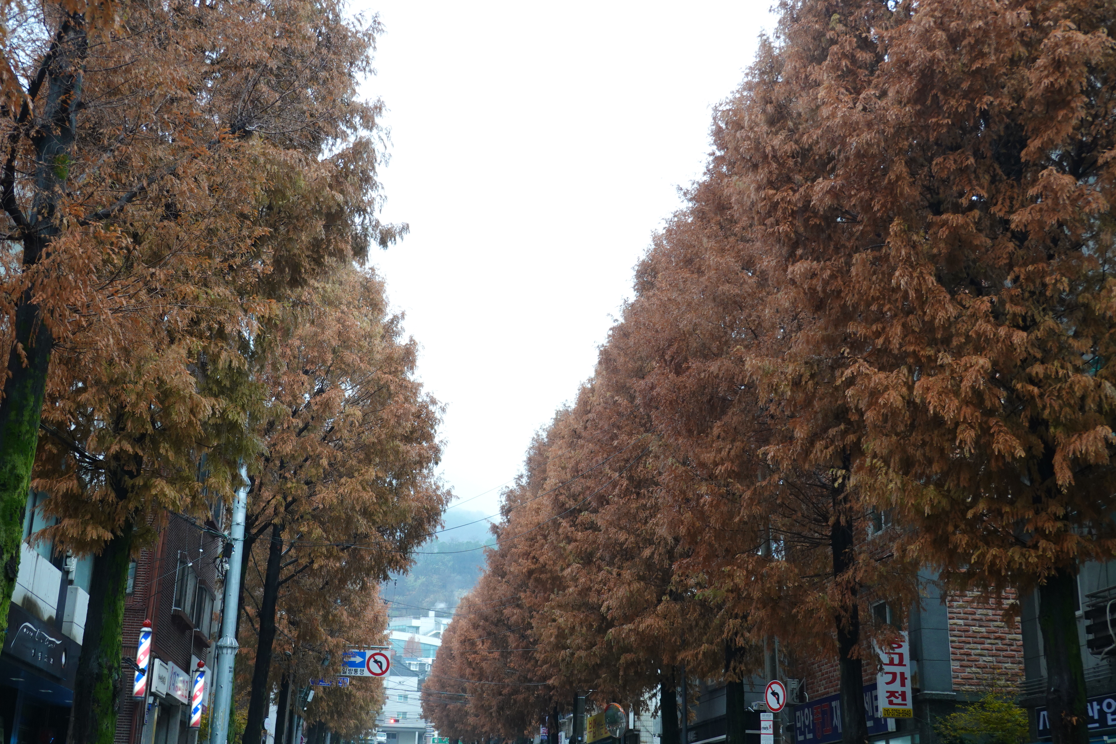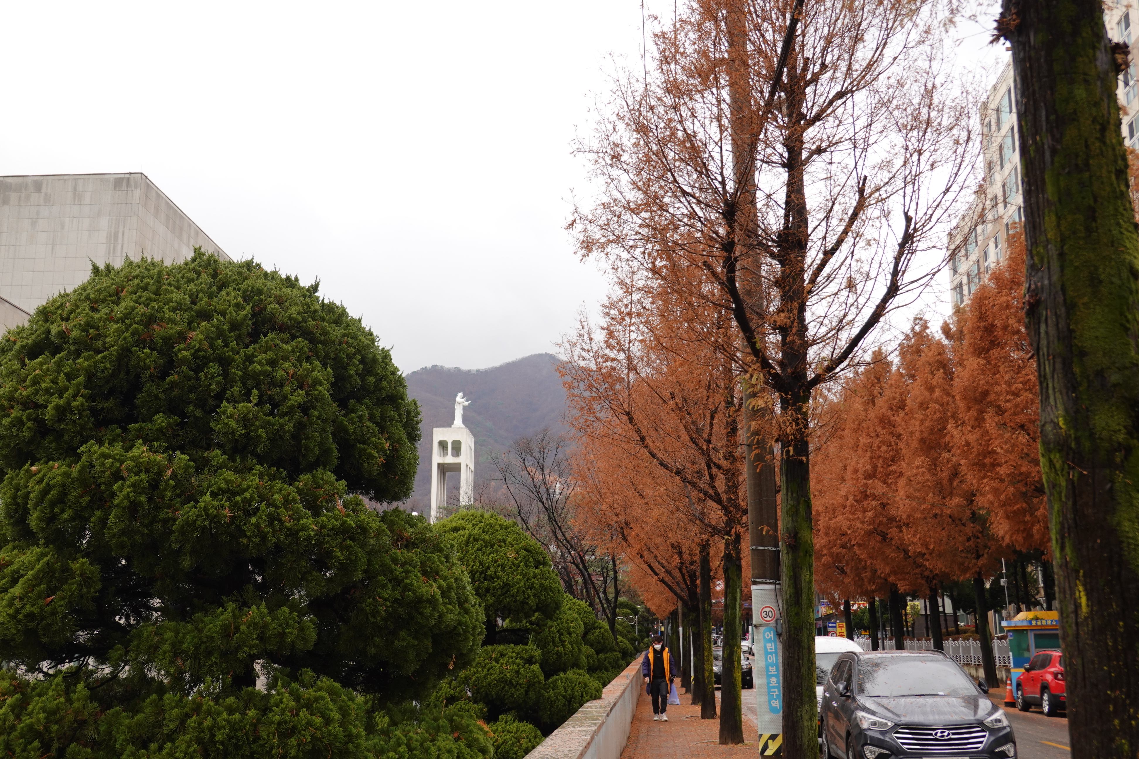 2021.11.30/ #안양 #동네 #골목 #가로수/ 갈색읏을 입은 안양 문예로 가로수. 안양6동 만안구청사거리에서 만안청소년수련관 방향 도로(문예로) 안양아트센터와 명학성당, 우양파크빌, 평강교회 중간에 놓여진 이 길은 안양6동과 8동의 경계로 오래전에 심은듯한 메타스콰이어 나무가 하늘로 쭉쭉 뻗어 안양에서 가장 멋진 가로수길중 하나다. 2017년 2월에 무지막지하게 짤라내는 강전지로 가지들이 처참하게 짤려나가 마치 옷을 벗은듯 흉칙하기까지 했었는데 시간이 흘러 다시금 가지들이 자라나 흉칙함을 가려주어서 다행스럽고 멋지다.