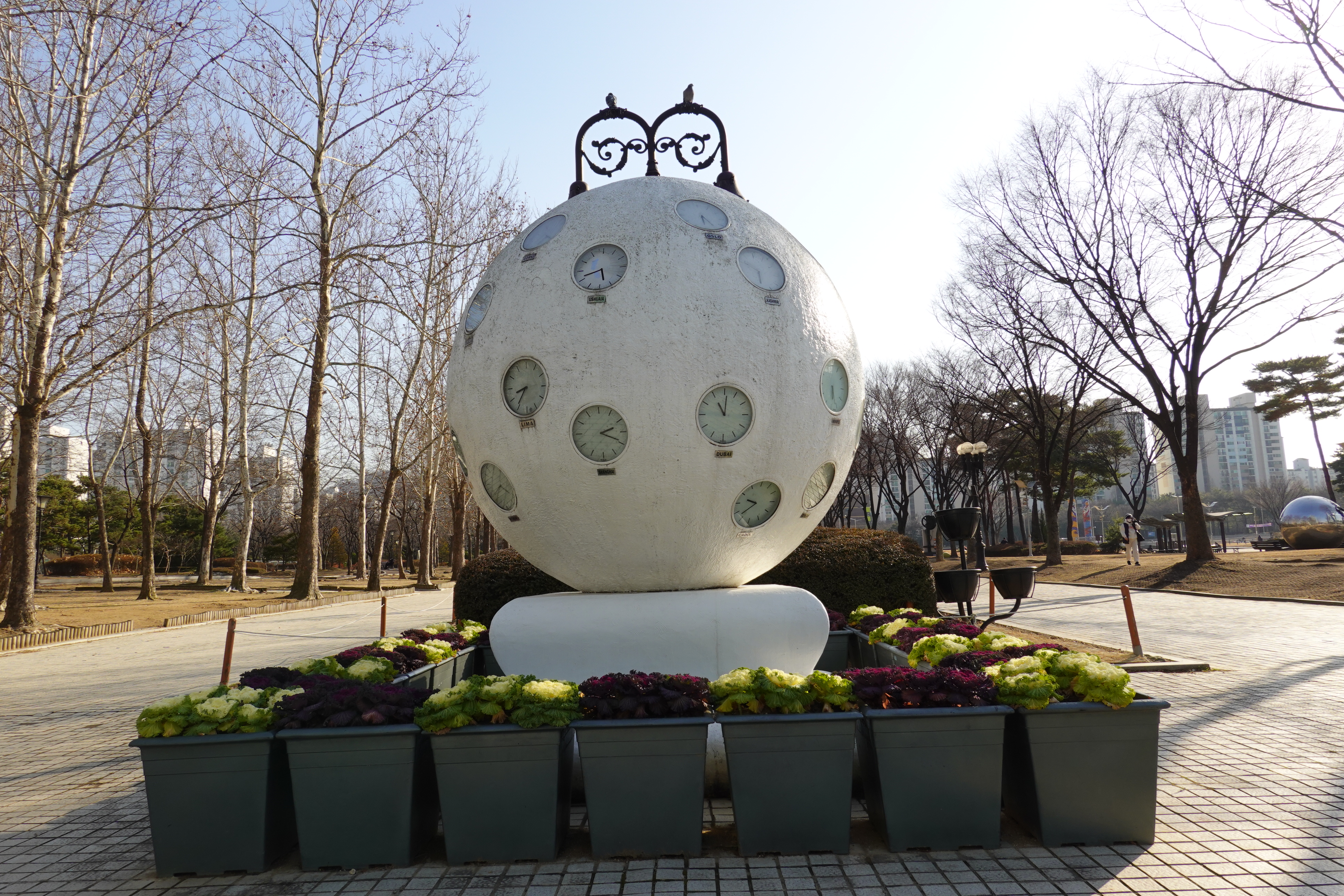 글로리아 프리드만, <시간의 파수꾼>, 2007. 제2회 apap(2007년) 당시 안양 중앙공원 좌측(한림대병원쪽 방향)에 설치한 작품으로, 세계 각국의 시간을 표시하는 구(球) 위에 한 인물을 세우고 한국의 시간을 상징하는 시계로 얼굴을 가려 놓았다. 인물은 시간을 볼 수 없으나, 아니 보려하지 않지만, 세계의 시간은 여전히 흘러간다. 인간의 실존적 위치를 탐구하는 작가에게 세계의 현실은 발전과 개발만을 위해 앞으로 나아갈 뿐 보다 근원적인 질문을 상실한 위기의 상황이다. 작가는 이 기념비적 작품을 통해 빠르게 흘러가는 시간 속에서 현재를 살아가는 우리의 모습을 돌아보고자 했다. <시간의 파수꾼>은 작가가 2007년 루브르미술관에서 선보였던 <현대인들(Contemporaries)>과 유사한 맥락에 위치한다. 퓌제 안뜰(Cour Puget)에 설치했던 <현대인들>에서는 시계로 얼굴을 가린 십여 개의 입상을 줄을 지어 계단에 세워 놓았고, 각각의 입상이 들고 있는 시계는 모두 동일한 시간을 가리키고 있었다. 그런데 2021년 12월 22일 공원 산책길에 바라보니 무언가 이상했다. 가만히 보니 등근 구 위에 세워져 있던 사람 형태의 파수꾼 인물상이 없어진것이다. 아래 사진에서 보면 둥근 구위에 시계를 든 인물상이 있었지만 현재는 사라진 것이다. 대체 어디로 갔을까. 어딘가 부서져서 수리중일까, 누가 훔쳐갔을까. 최소한 공공예술작품을 관리 유지 보수할 책임이 있는 안양시문화예술재단에서 인물상이 사라진 이유등 설명과 해명에 대한 설명문이라도 적어 작품앞에 표시해야 하지 않을까. 궁금중이 발동해 인터넷을 뒤적였더니 2020년 여름 한반도를 지난가는 태풍의 영향으로 인물상이 파손 또는 훼손돼 철거됐다는 이야기가 어느분 블로그(https://blog.naver.com/wakame5/222279660606)에 적혀있다. 안양시나 안양시문화예술재단의 공식적인 설명이 있어야 하지않을까 싶다.