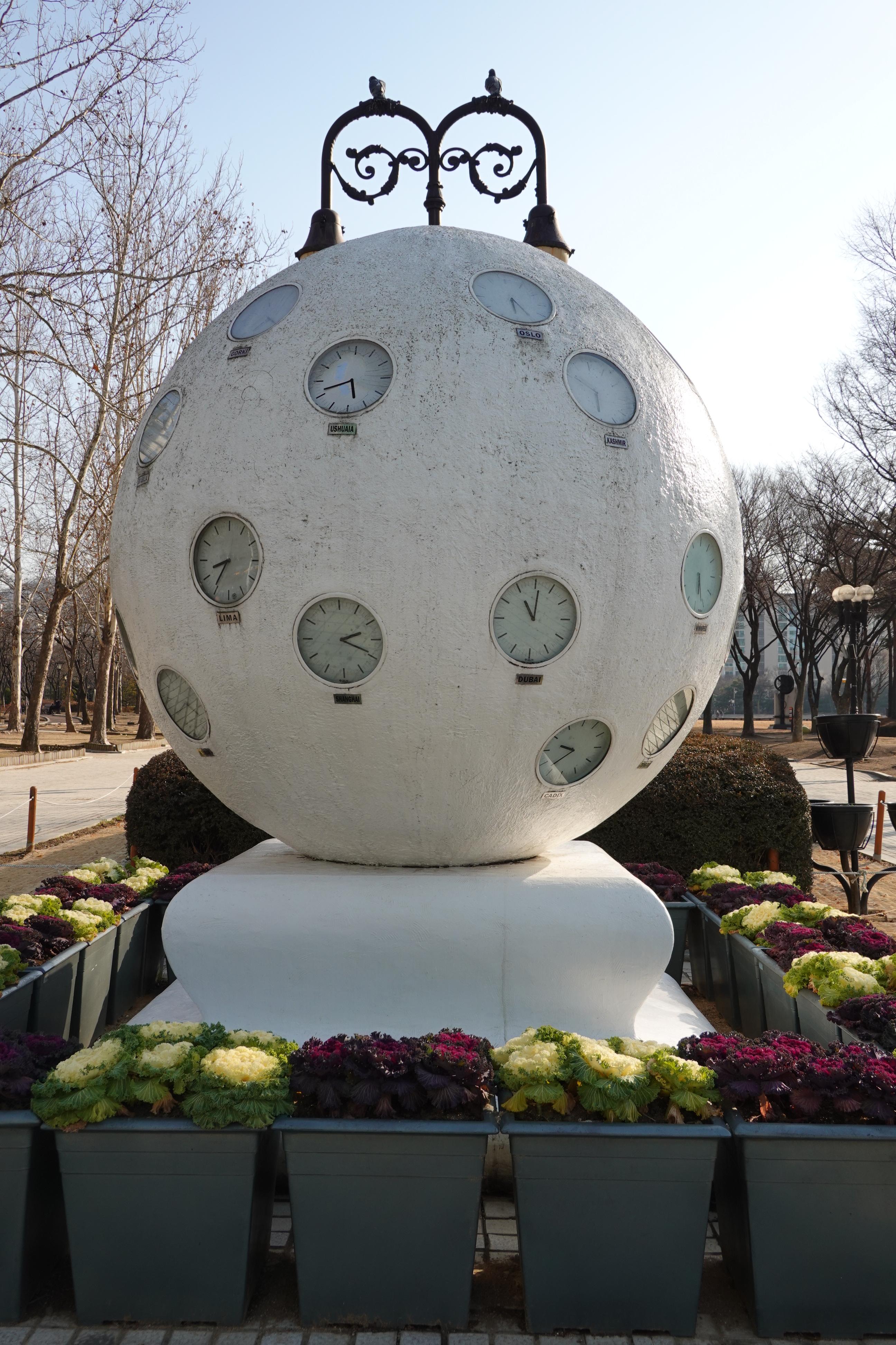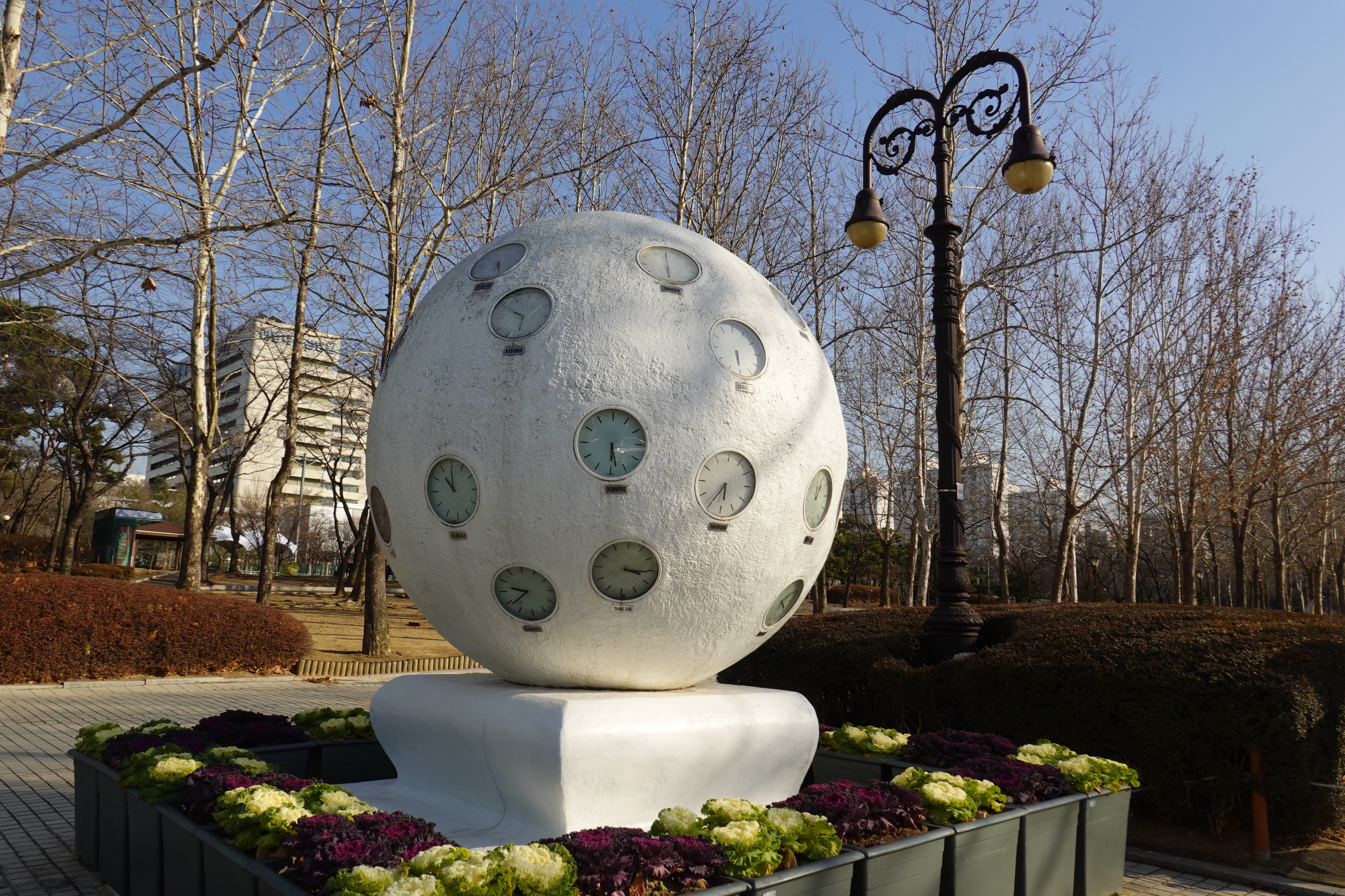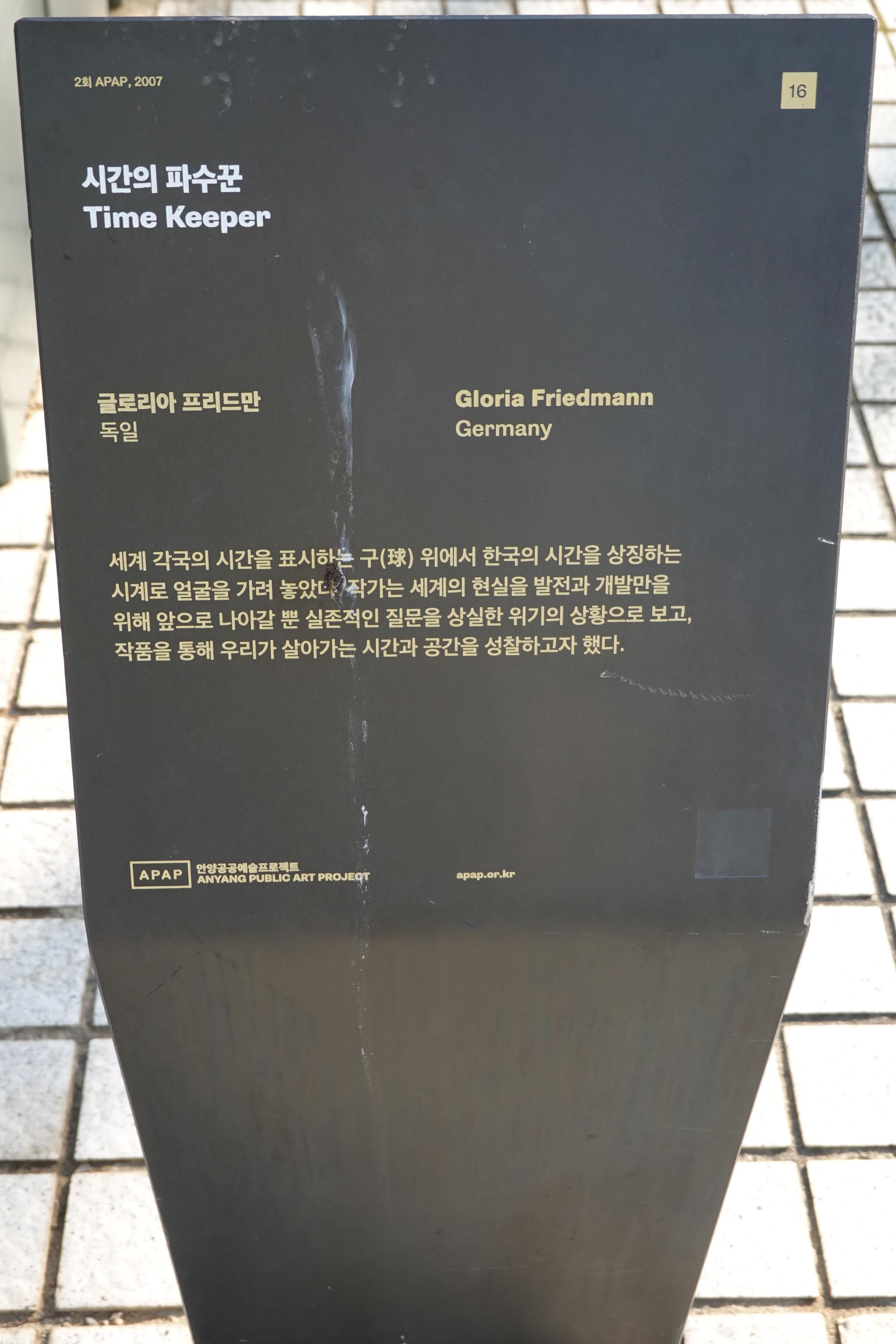 글로리아 프리드만, <시간의 파수꾼>, 2007. 제2회 apap(2007년) 당시 안양 중앙공원 좌측(한림대병원쪽 방향)에 설치한 작품으로, 세계 각국의 시간을 표시하는 구(球) 위에 한 인물을 세우고 한국의 시간을 상징하는 시계로 얼굴을 가려 놓았다. 인물은 시간을 볼 수 없으나, 아니 보려하지 않지만, 세계의 시간은 여전히 흘러간다. 인간의 실존적 위치를 탐구하는 작가에게 세계의 현실은 발전과 개발만을 위해 앞으로 나아갈 뿐 보다 근원적인 질문을 상실한 위기의 상황이다. 작가는 이 기념비적 작품을 통해 빠르게 흘러가는 시간 속에서 현재를 살아가는 우리의 모습을 돌아보고자 했다. <시간의 파수꾼>은 작가가 2007년 루브르미술관에서 선보였던 <현대인들(Contemporaries)>과 유사한 맥락에 위치한다. 퓌제 안뜰(Cour Puget)에 설치했던 <현대인들>에서는 시계로 얼굴을 가린 십여 개의 입상을 줄을 지어 계단에 세워 놓았고, 각각의 입상이 들고 있는 시계는 모두 동일한 시간을 가리키고 있었다. 그런데 2021년 12월 22일 공원 산책길에 바라보니 무언가 이상했다. 가만히 보니 등근 구 위에 세워져 있던 사람 형태의 파수꾼 인물상이 없어진것이다. 아래 사진에서 보면 둥근 구위에 시계를 든 인물상이 있었지만 현재는 사라진 것이다. 대체 어디로 갔을까. 어딘가 부서져서 수리중일까, 누가 훔쳐갔을까. 최소한 공공예술작품을 관리 유지 보수할 책임이 있는 안양시문화예술재단에서 인물상이 사라진 이유등 설명과 해명에 대한 설명문이라도 적어 작품앞에 표시해야 하지 않을까. 궁금중이 발동해 인터넷을 뒤적였더니 2020년 여름 한반도를 지난가는 태풍의 영향으로 인물상이 파손 또는 훼손돼 철거됐다는 이야기가 어느분 블로그(https://blog.naver.com/wakame5/222279660606)에 적혀있다. 안양시나 안양시문화예술재단의 공식적인 설명이 있어야 하지않을까 싶다.