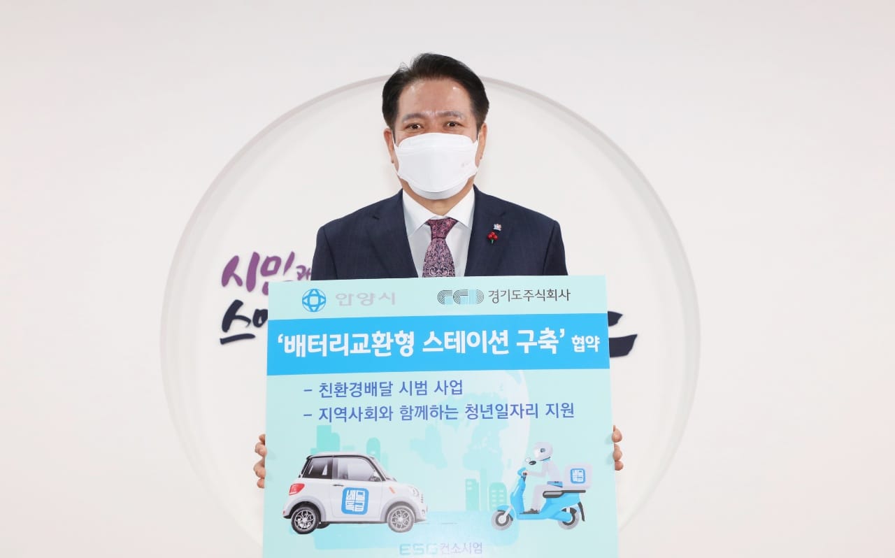 안양시는 지난 27일 경기도주식회사·ESG컨소시엄과 배터리교환형 스테이션 구축 및 친환경 배달 시범사업 협약을 맺었다.