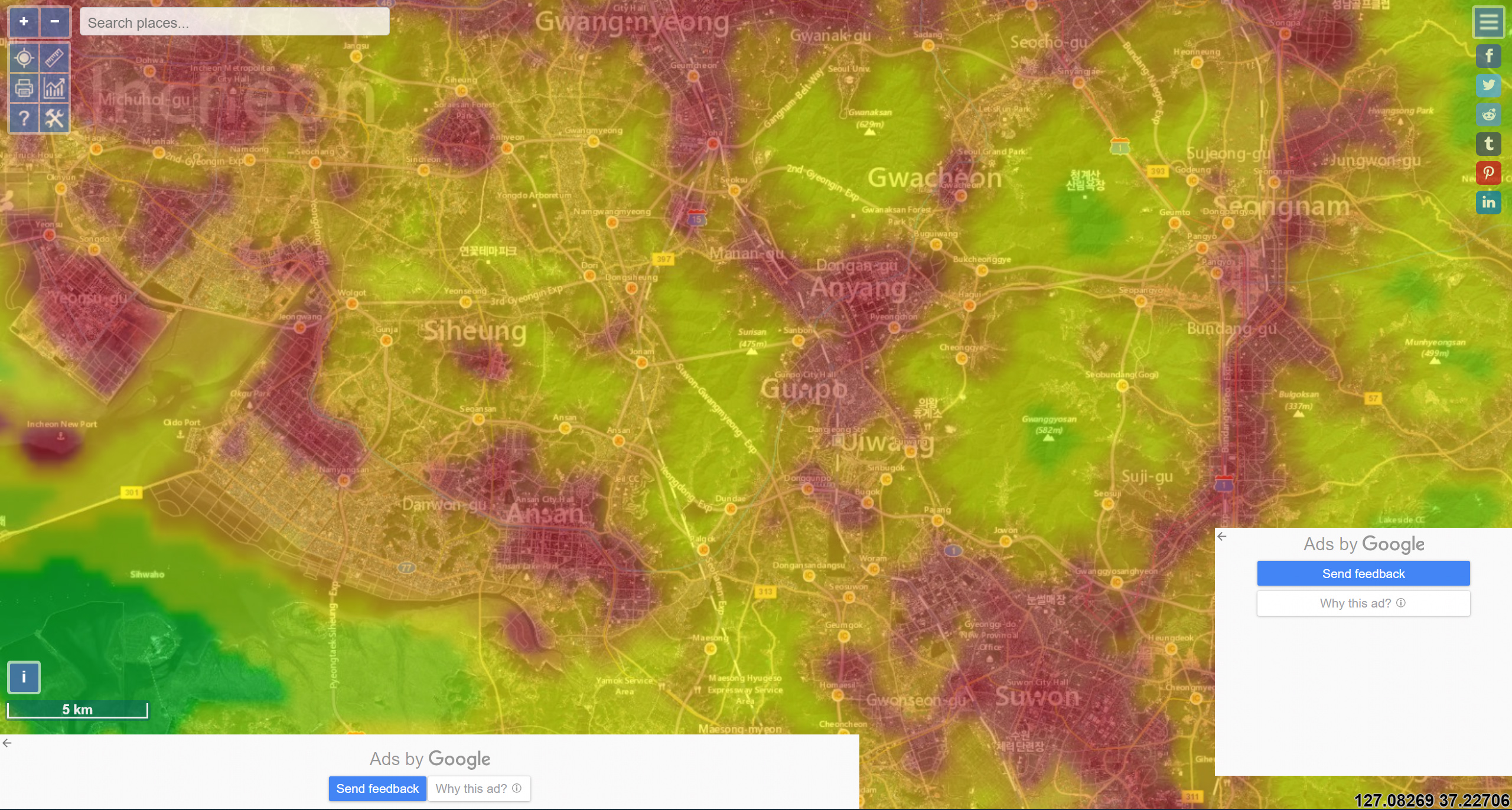 붉은색일수록 광해가 많습니다.