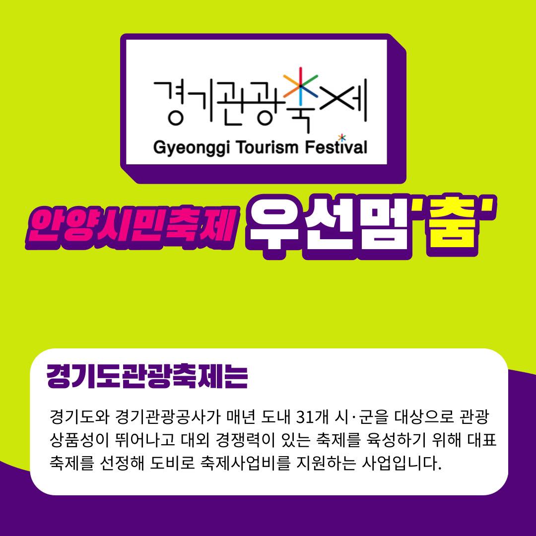 안양시는 시민이 기획하고 참여한 안양시민축제‘우선멈‘춤’이’경기도대표 관광축제인 「2022 경기관광축제」에 선정됐다고 26일 밝혔다.