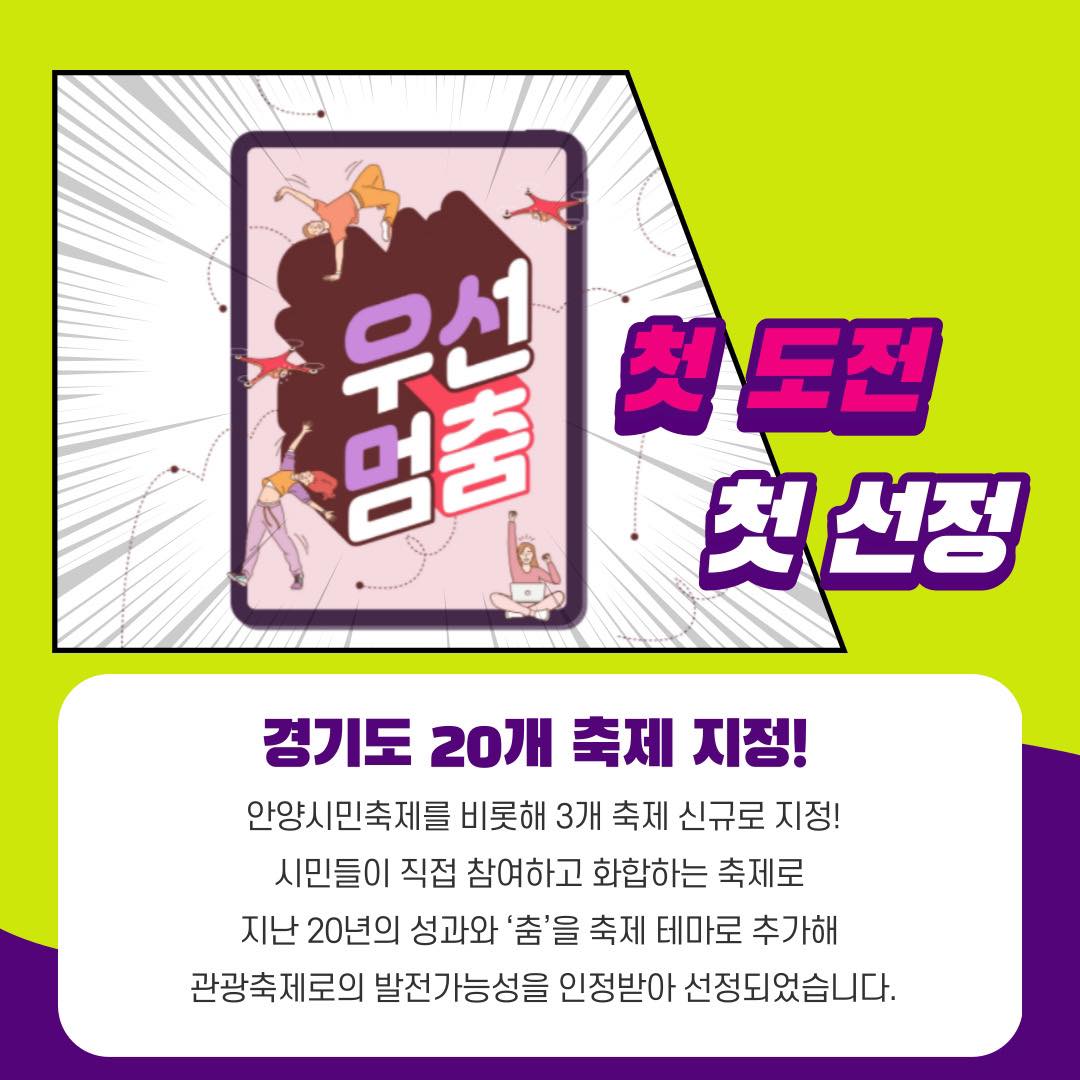 이번에 선정된 우선멈‘춤’<안양시민축제>는 시민들이 직접 참여하고 화합하는 축제로 지난 20년의 성과와 ‘춤’을 축제 테마로 추가하여 관광축제로의 발전가능성을 인정받아 첫 도전에 선정되는 쾌거를 이루어냈다.