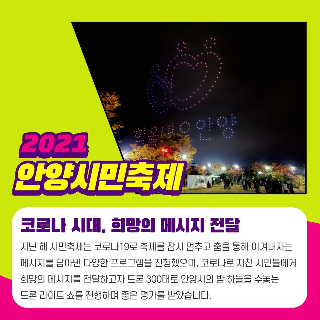 전년도 축제는 온라인 및 일부 현장축제로 개최되어 코로나19로 축제를 잠시 멈추고 춤을 통해 이겨내자는 메시지를 담아낸 다양한 프로그램을 진행하였으며, 코로나로 힘든 시민들에게 희망의 메시지를 전달하고자 300대의 드론으로 안양시의 밤하늘을 수놓으며 희망을 안겨주는 드론라이트쇼을 기획하여 좋은 평가를 받았다.