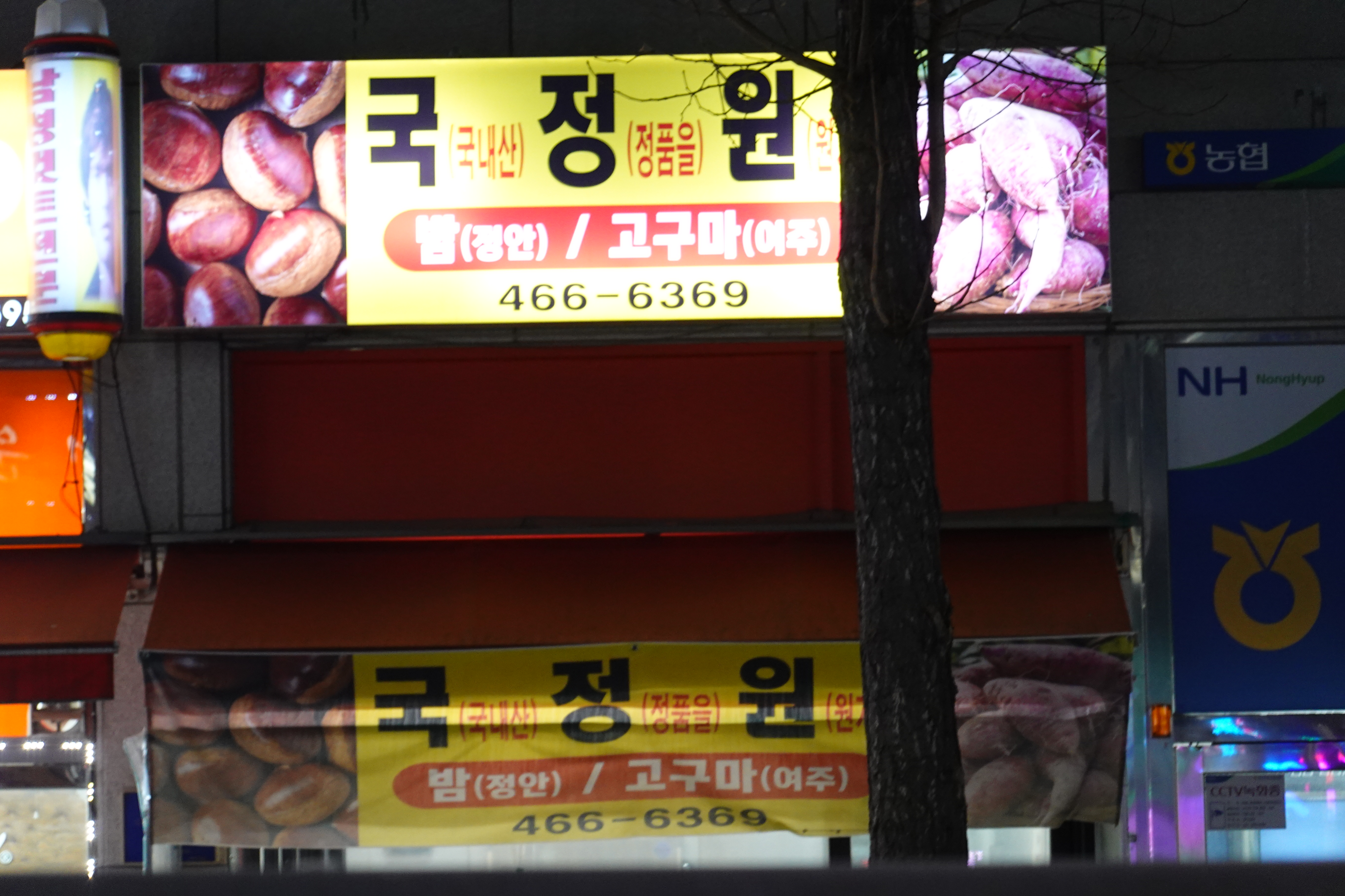 2022.02.12/ #안양 #동네 #골목 #간판 #국정원/ 안양 중앙시장 3문앞 사거리 구운 밤과 고구마를 파는 가게 이름이 국정원이다. 마치 대한민국 국가 정보기관을 통칭하는 국정원을 떠오르게 하는데 간판에 나열한 설명을 보니 국(국내산)정(정품을)원(원가로)이라니 기막힌 발상이다. 1970년대 안양에는 곧망할 간판을 내건 카페(당시 얼마 지나지 않아 곧 간판을 내렸는데 망한것이 아니라 사찰기관의 압력 때문에 내렸지요)도 있었고 1980년대에는 대합실, 길모퉁이카페, 들판경양식, 동굴다방, 샤갈의 눈내리는 마을 등 예쁜 이름의 간판들이 많았다.