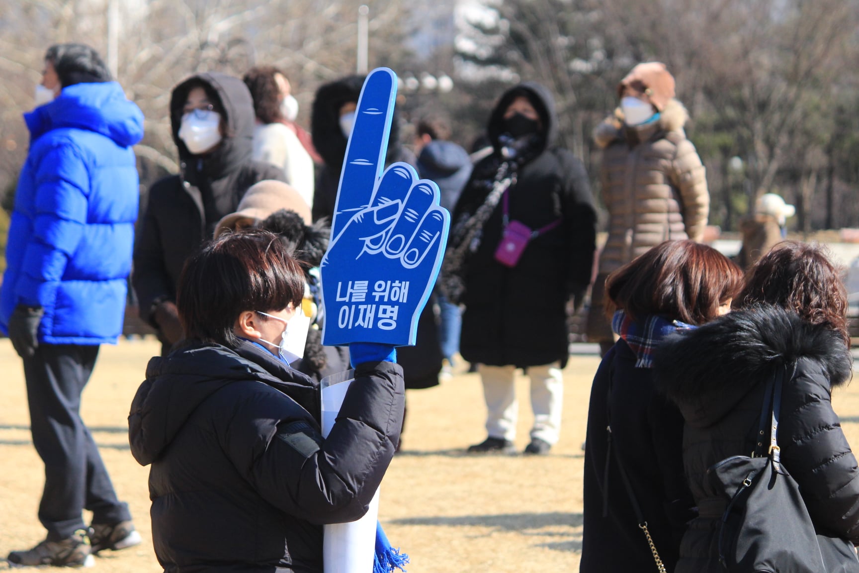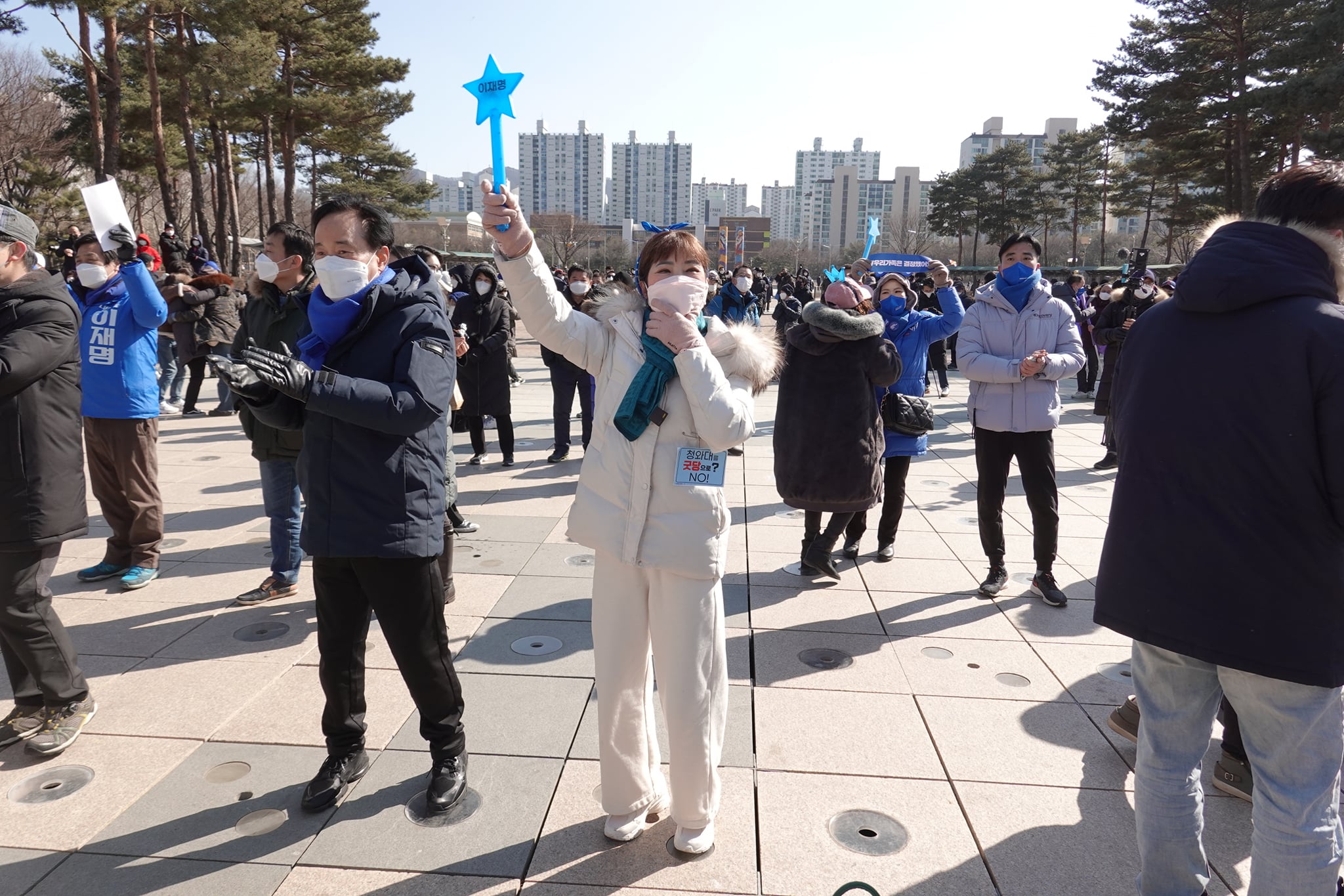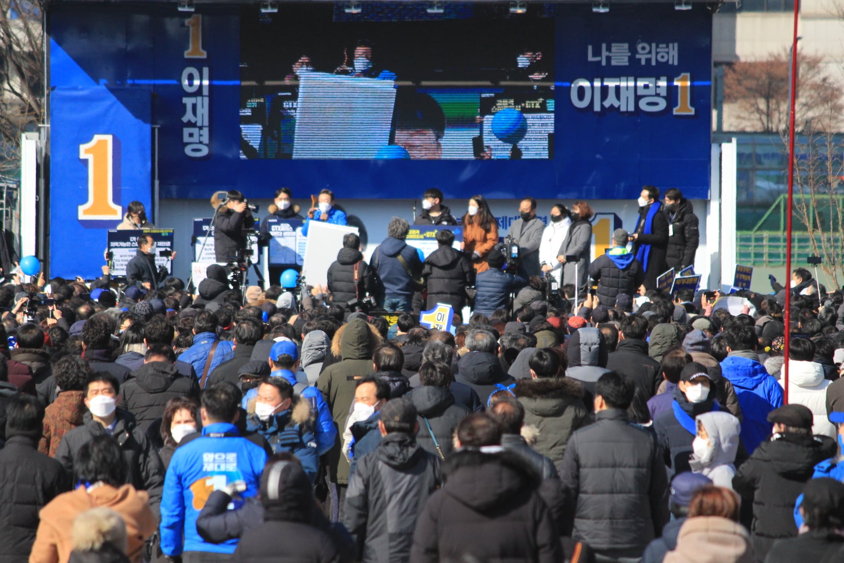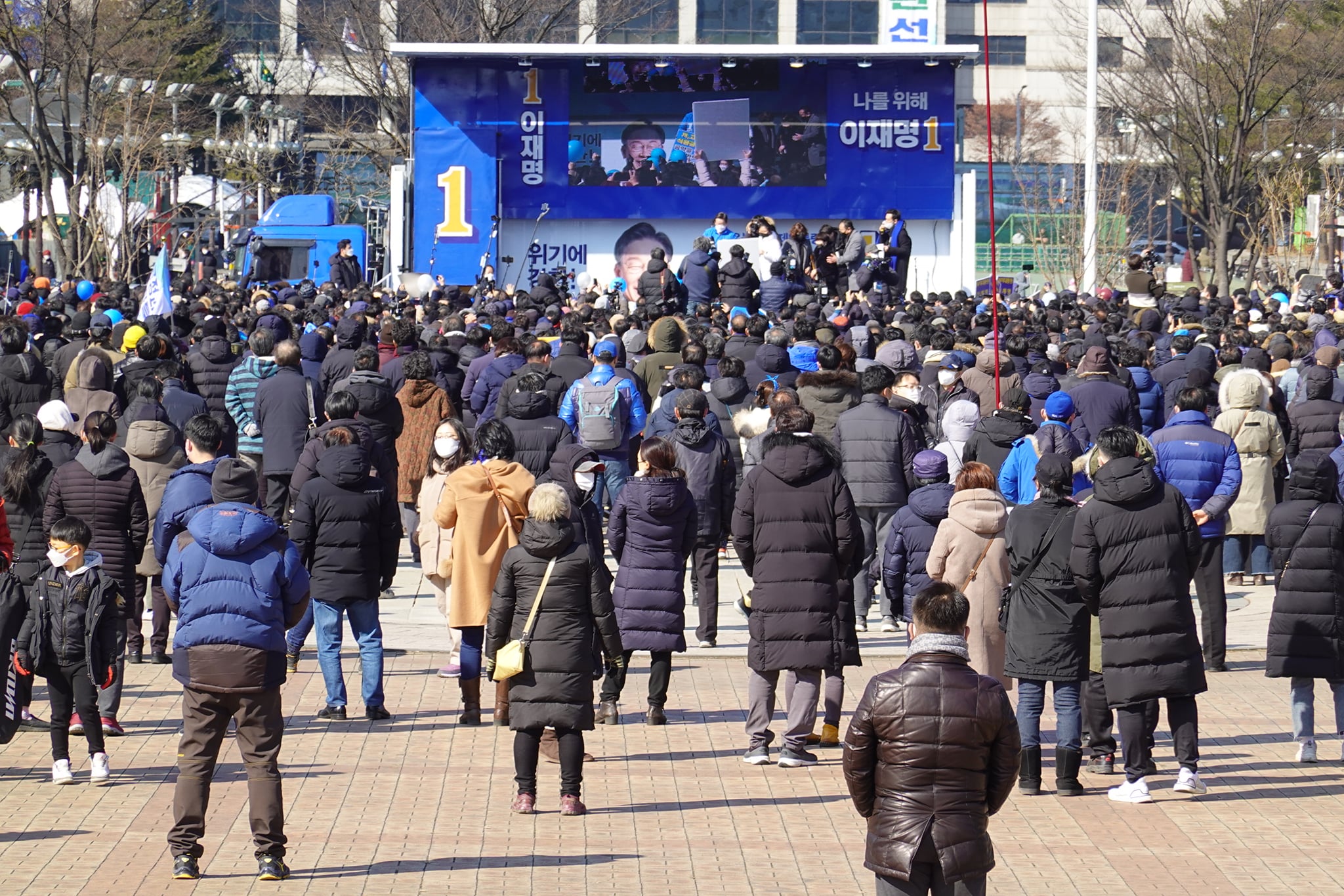 2022.02.20/ #안양 #20대대통령선거 #중앙공원 #선거유세 #이재명/ 안양 평촌 중앙공원 이재명후보 유세장 풍경. 20대 대통령 선거 투표를 20여 일 앞둔 20일 안양 평촌공원에서 열린 더불어민주당 이재명 후보의 선거 유세장에 옷깃을 여미는 칼바람이 부는 추운 날씨에도 불구하고, 6-7천여명(언론 추산)의 시민들이 운집해 뜨거운 열기를 뿜어냈다.